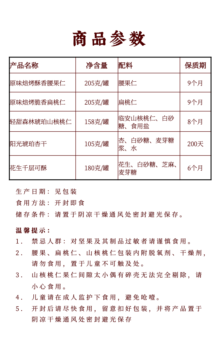 【生产日期/保质期】 焙烤腰果仁:2025.1.21(9个月) 焙烤扁桃仁:2024.9.11/2025.1.21(9个月) 森林琥珀山核桃仁:2025.1.15(8个月) 花生千层可酥:2025.2.21(6个月) 阳光琥珀杏干:2025.1.15(200天) 批次不同生产日期有所不同,请以收到的商品为准~ |