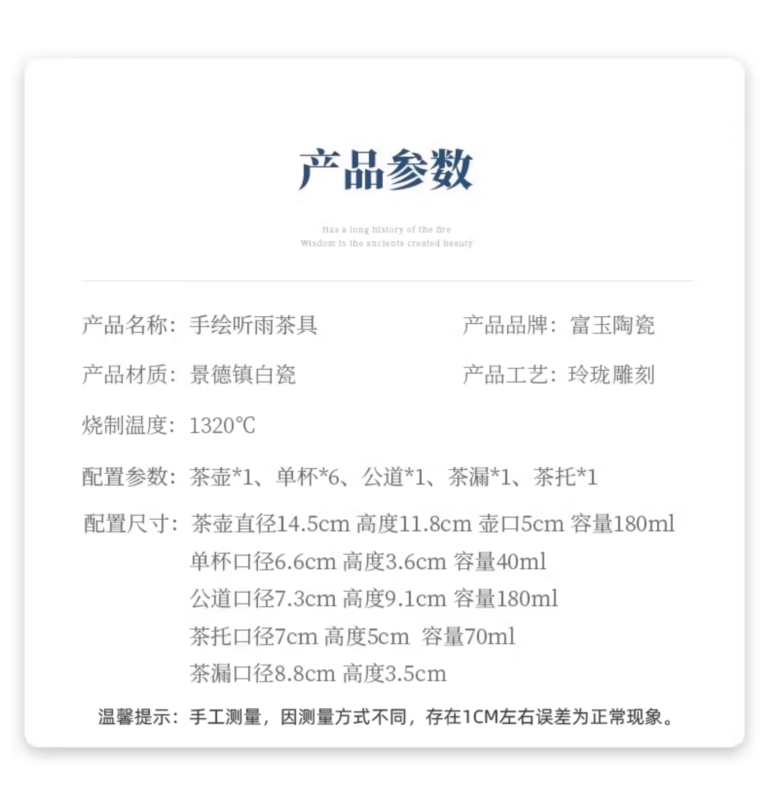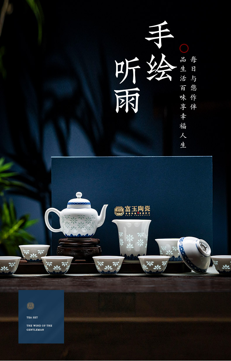 富玉景德镇玲珑手绘听雨功夫茶具套组礼盒包装
