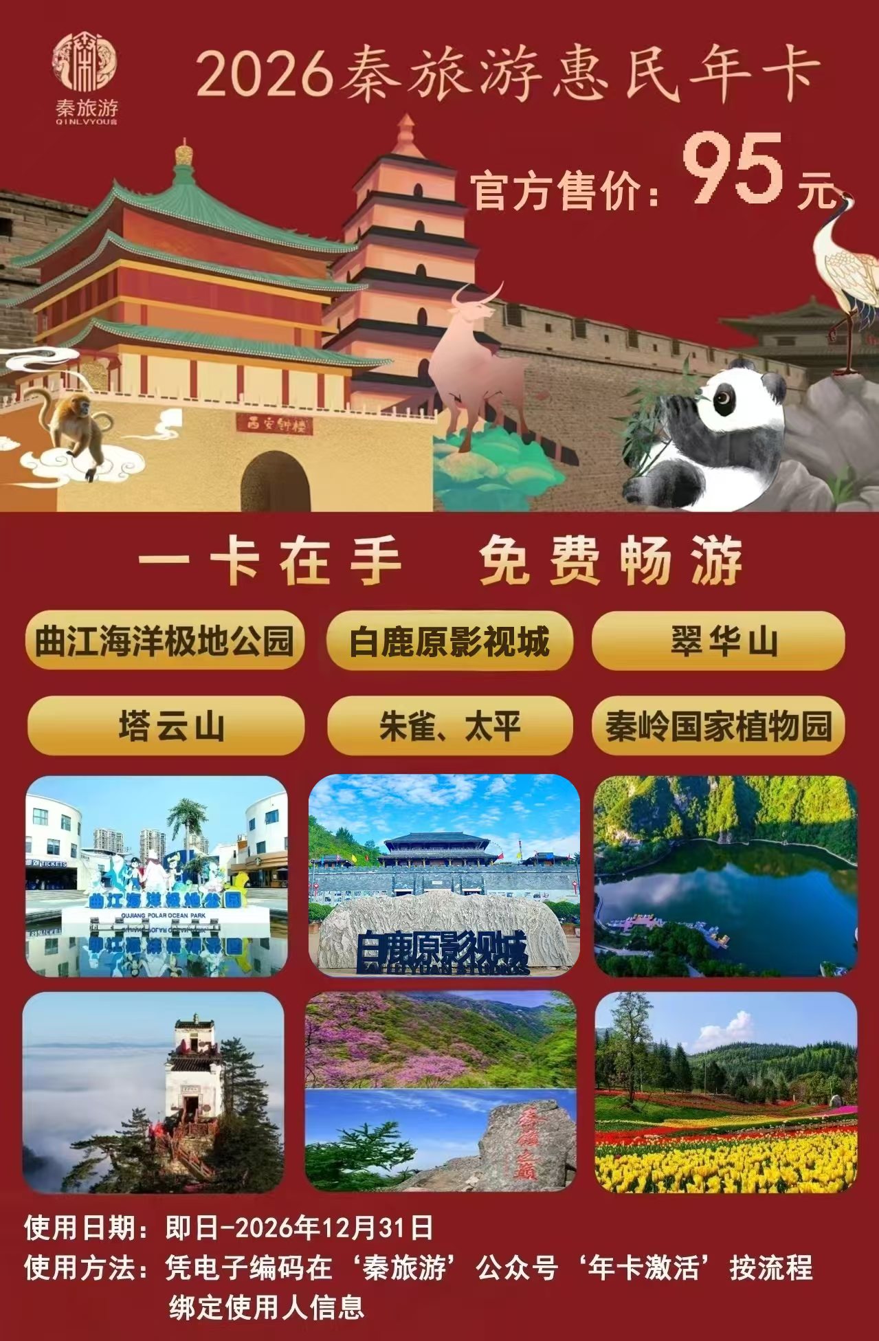 持卡免费逛【曲江海洋极地公园】、翠华山、塔云山、朱雀、太平、奉岭国家植物园等超多家优质景区!2026秦旅游惠民年卡仅需95元/张
