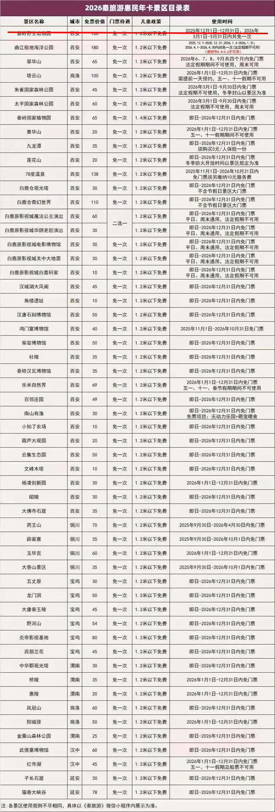 1.本年卡有效期至2026年12月31日,个别景区场馆指定日期使用有效,详情以“秦旅游”公众号内各景区使用规则为准。一人一卡,不可转借。