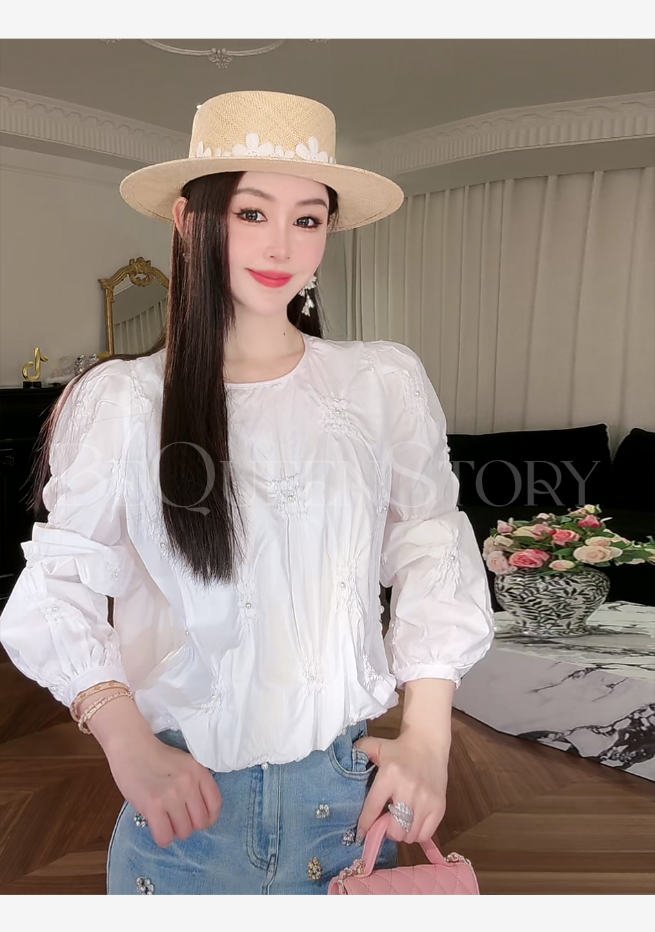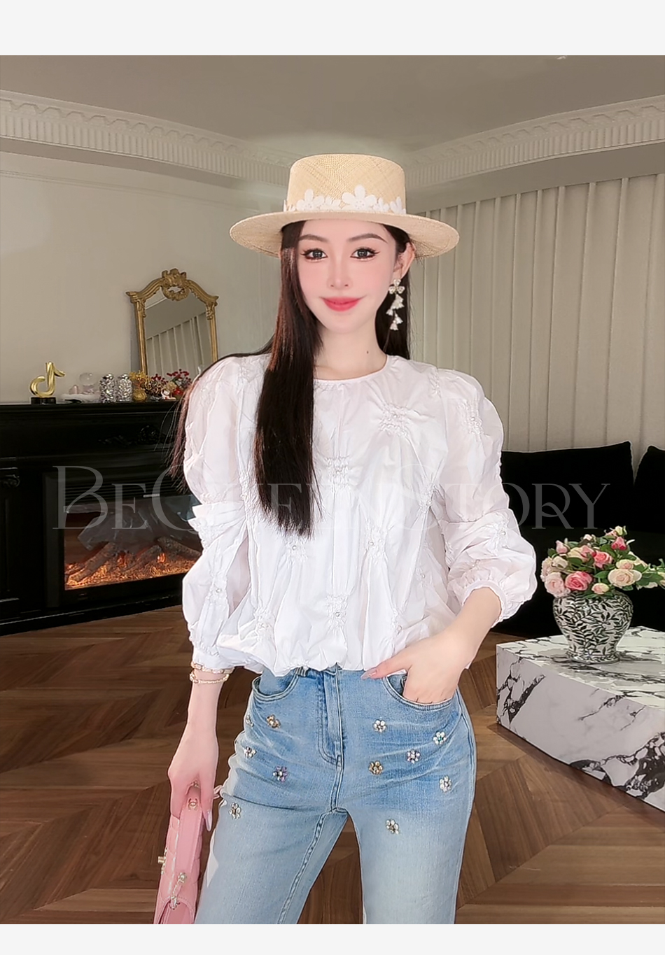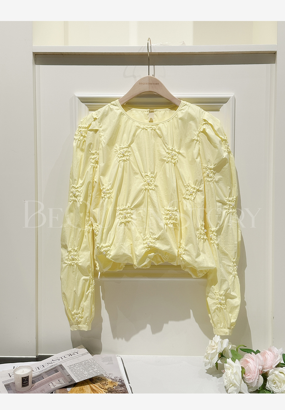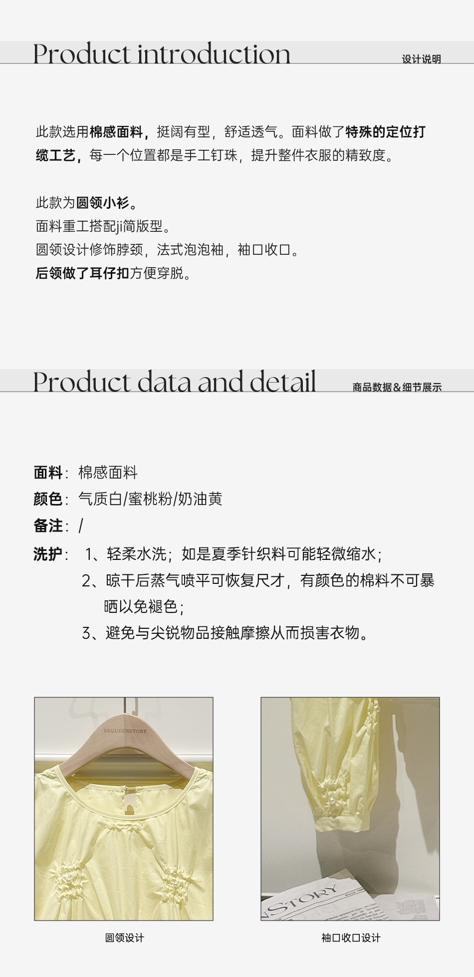 【孤品样衣,不退不换】【茶色花香】高级感欧若风透气法式圆领泡泡袖棉感上衣