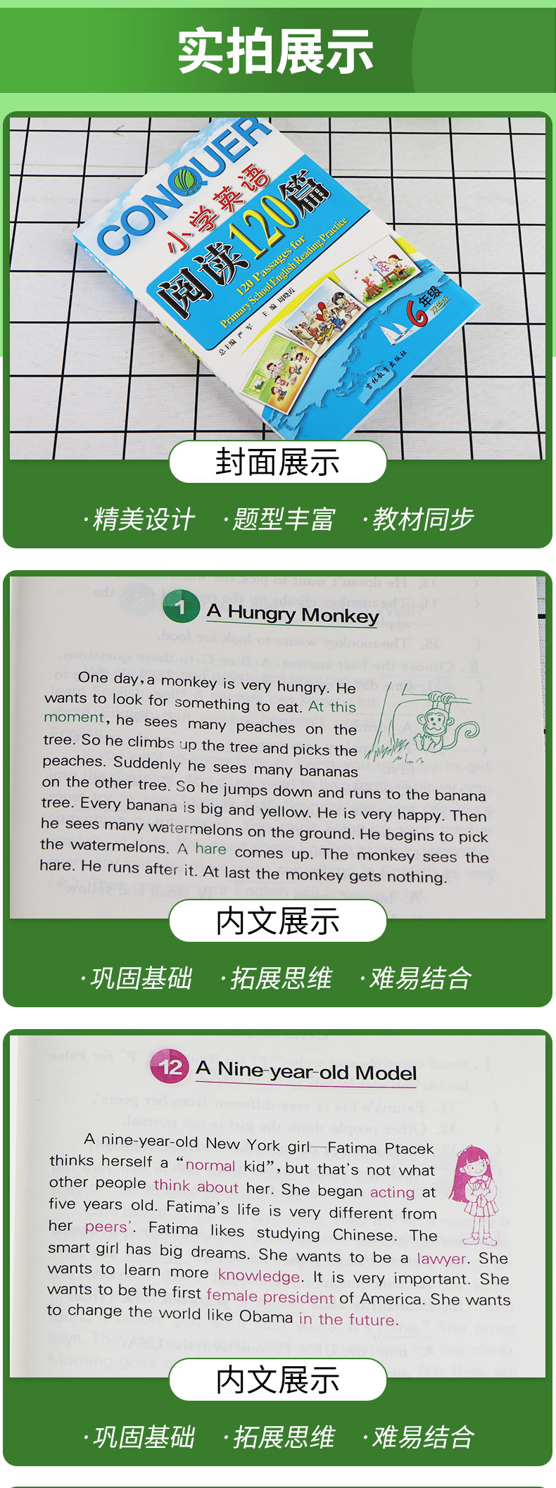 《小学英语阅读120篇》的推出,将引领小读者进入一个五彩缤纷、有益实用的英语世界。本书的编排遵循少年儿童的心理特点,旨在通过生动有趣的故事、寓言、科普小品、儿歌、谜语等内容,使学生接触一些英语短文,了解西方文化,体验学习英语的乐趣。本书图文并茂,题型多样,语言直观、形象、生动,贴近学生生活,很适合小学生阅读,能够极大地激发他们的求知欲,调动他们的学习兴趣,发展他们的自主学习能力。