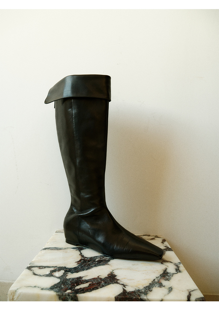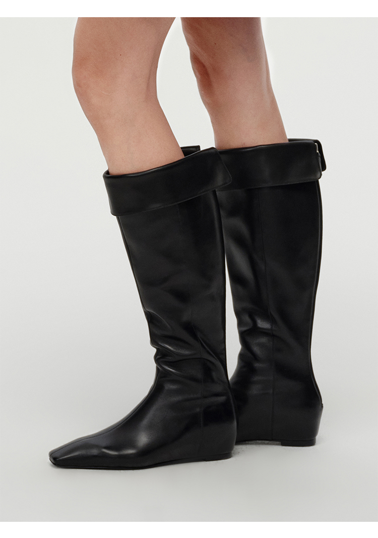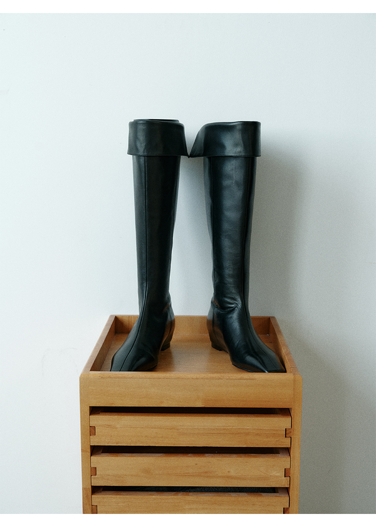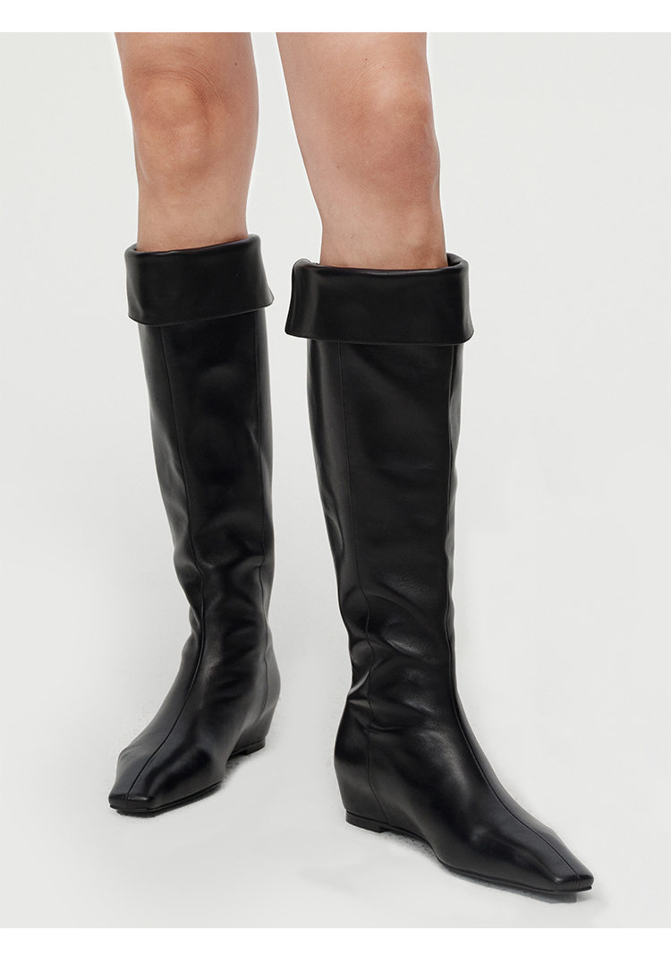 HIDEMI【当当同款】经典尖方头内增高系列高筒翻折设计感进口胎牛皮长靴