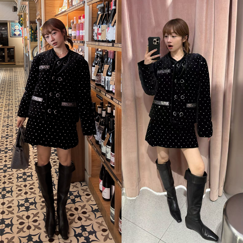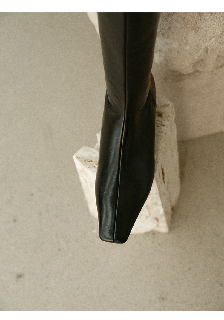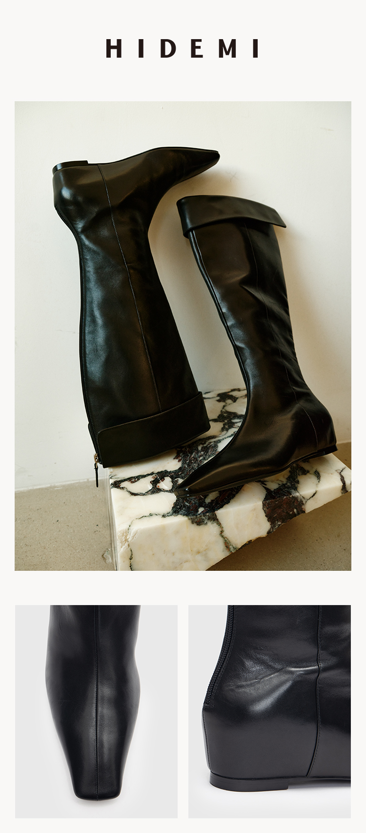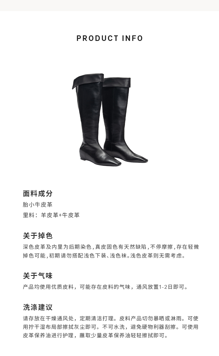 HIDEMI【当当同款】经典尖方头内增高系列高筒翻折设计感进口胎牛皮长靴