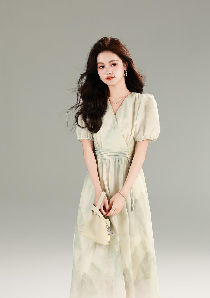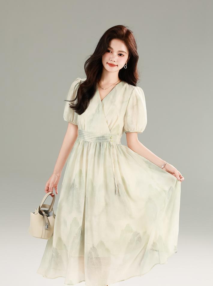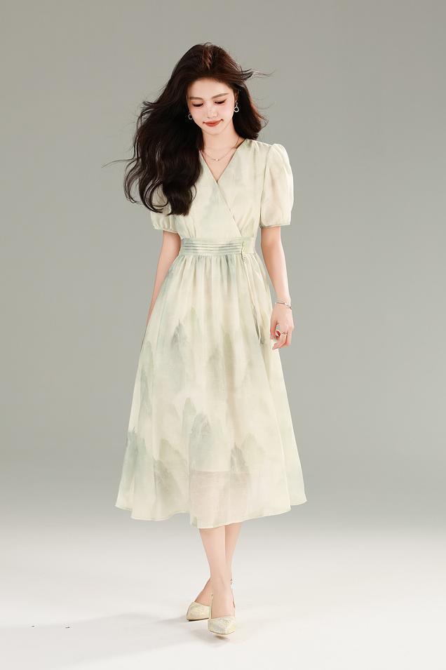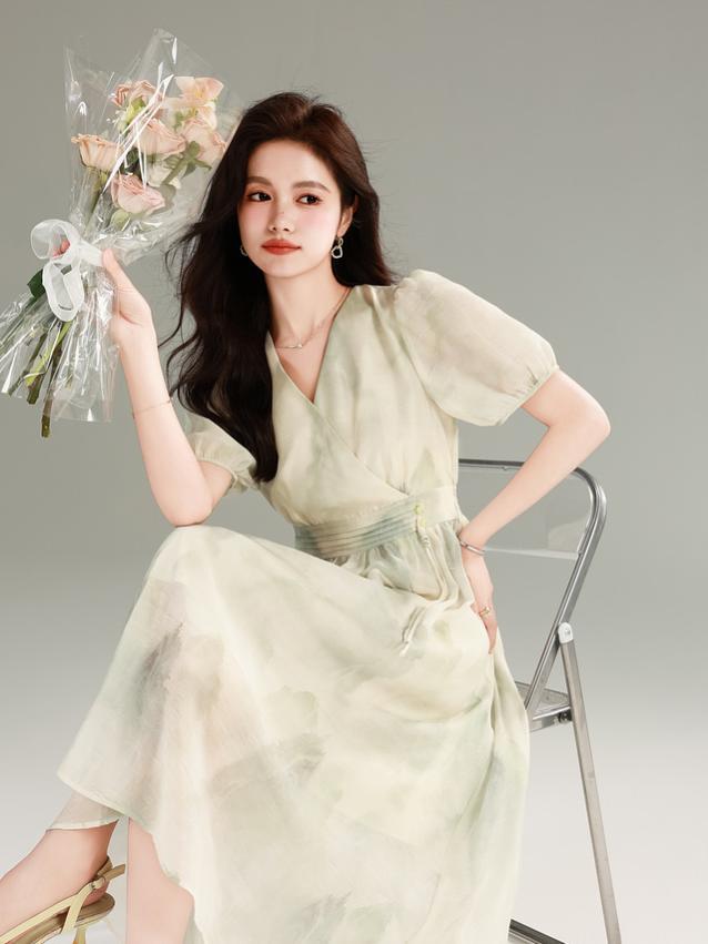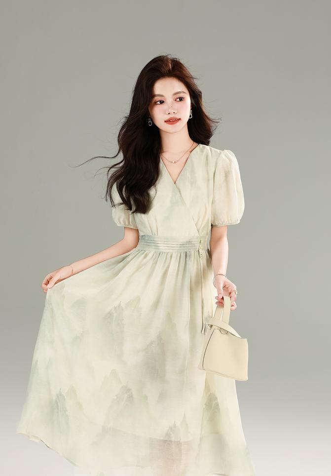 谁懂啊! 这条裙子把江南水乡的温柔穿在身上了! 复古印花不是普通碎花 是泼墨山水般的晕染纹路 远看像水墨画近看有细闪 配上花灰色底布简直是 “行走的国风画卷” 侧腰那排手工盘扣太绝了 翡翠绿的盘扣缀着流苏 走路时流苏轻扫过腰间 像古装剧里大小姐的裙摆 这新中式氛围感直接拉满