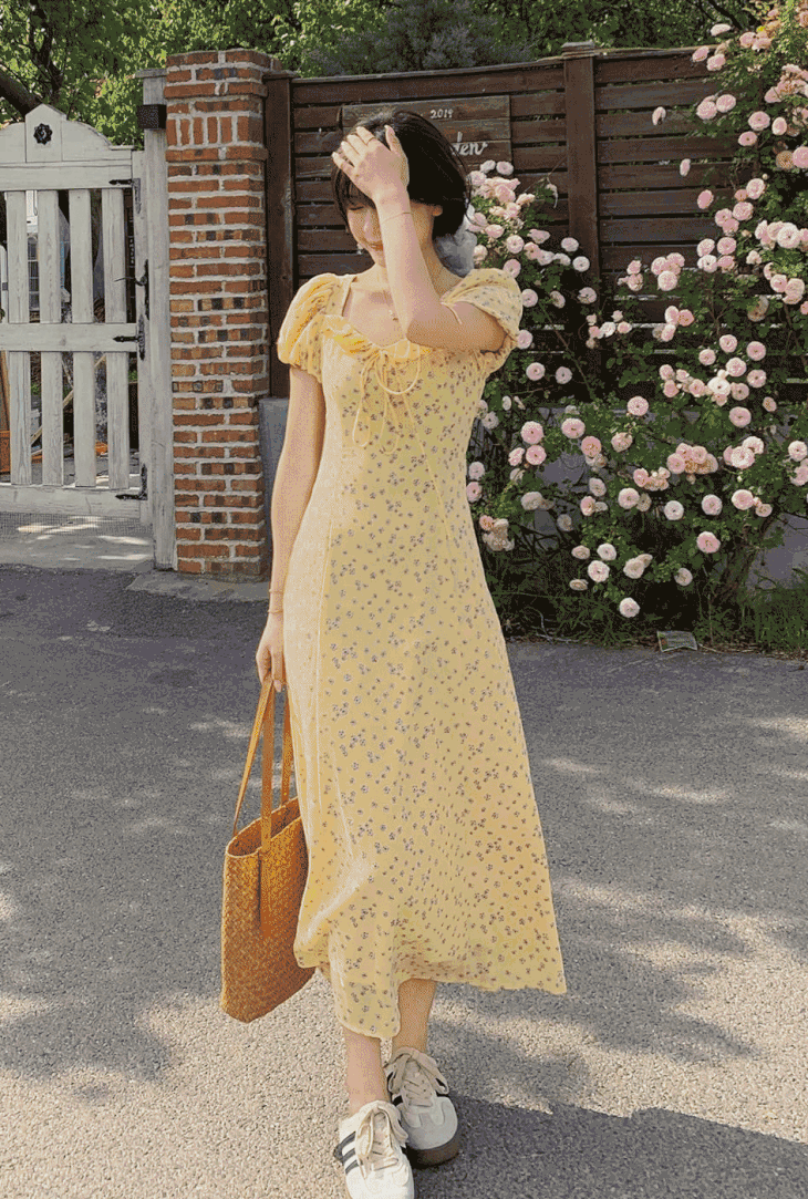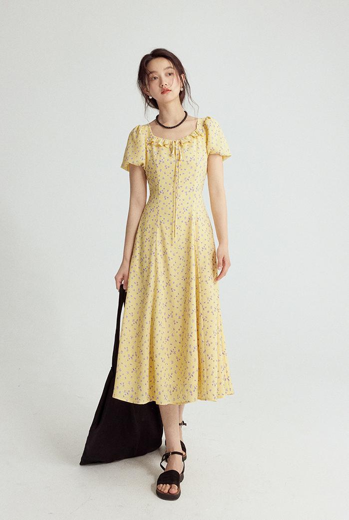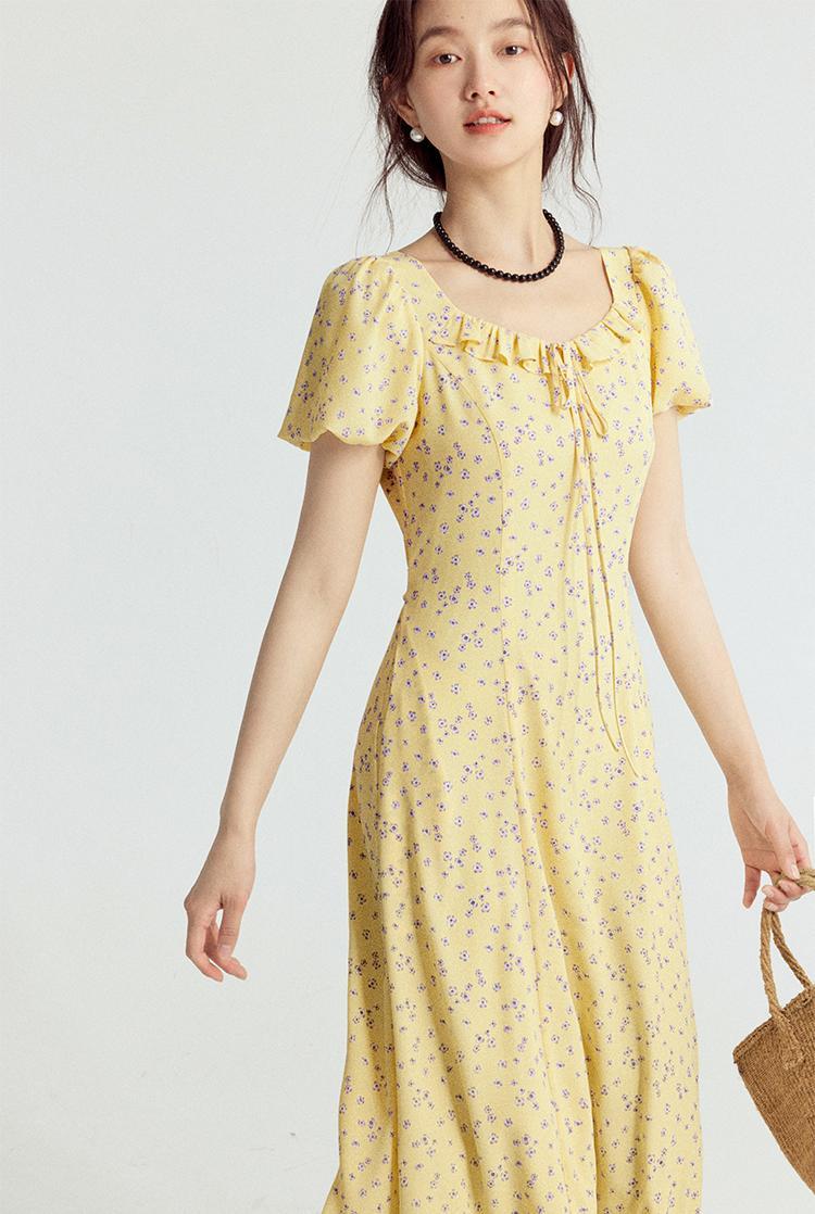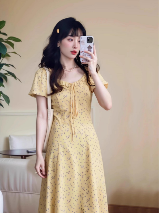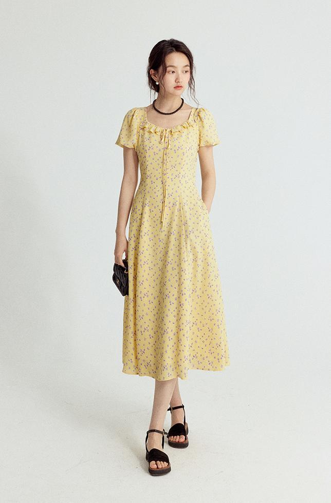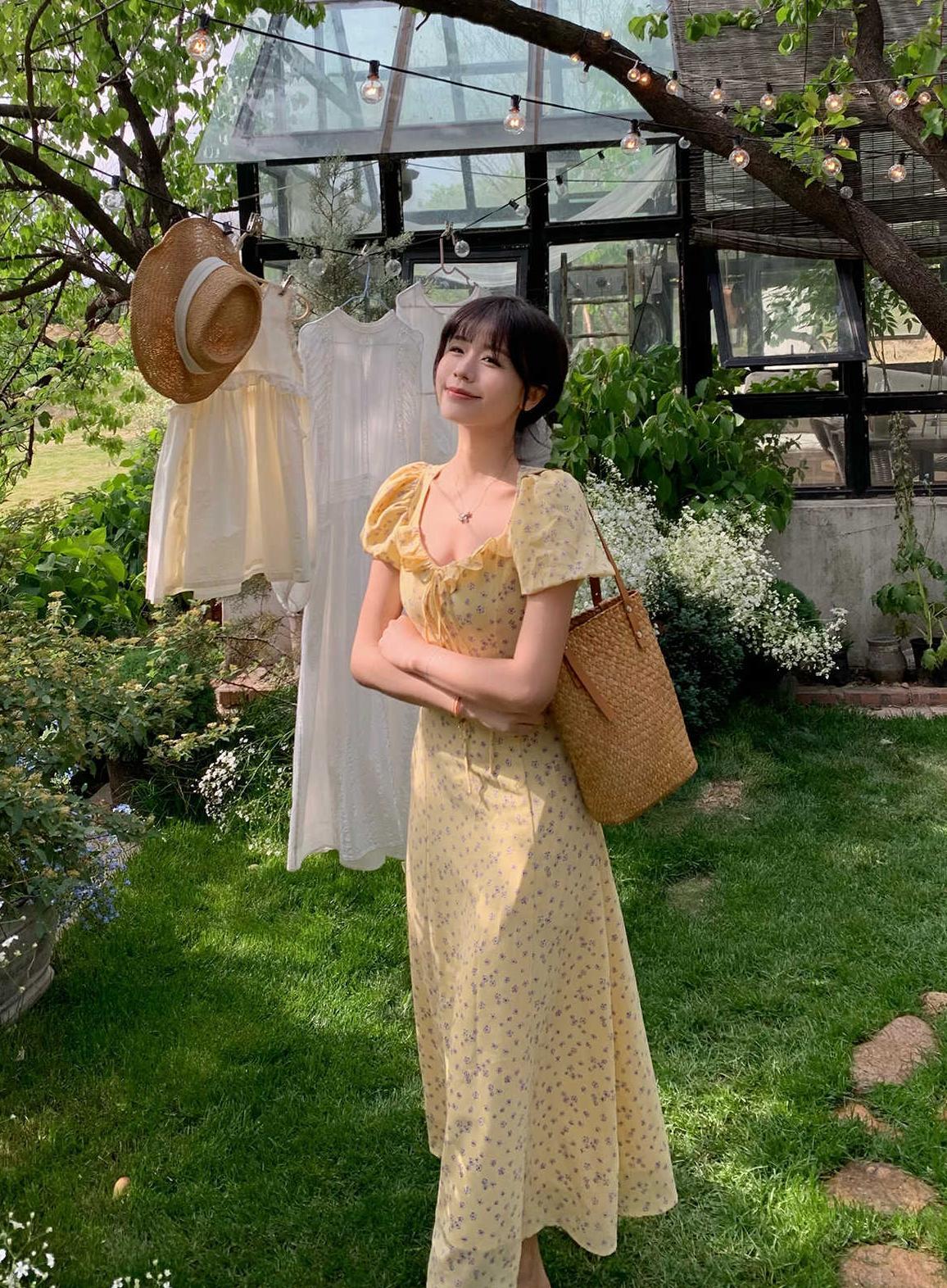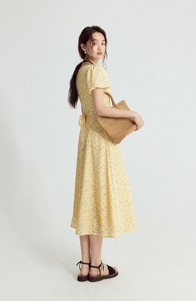 一袭淡黄碎花连衣裙 是春日写给人间的情诗 方领设计恰到好处地露出精致锁骨与修长脖颈 瞬间提升优雅气质 修饰脸型效果也十分出众 腰间的系带,勾勒曼妙身姿 每一步都似摇曳生姿的舞步 凸显身材曲线,打造迷人S型