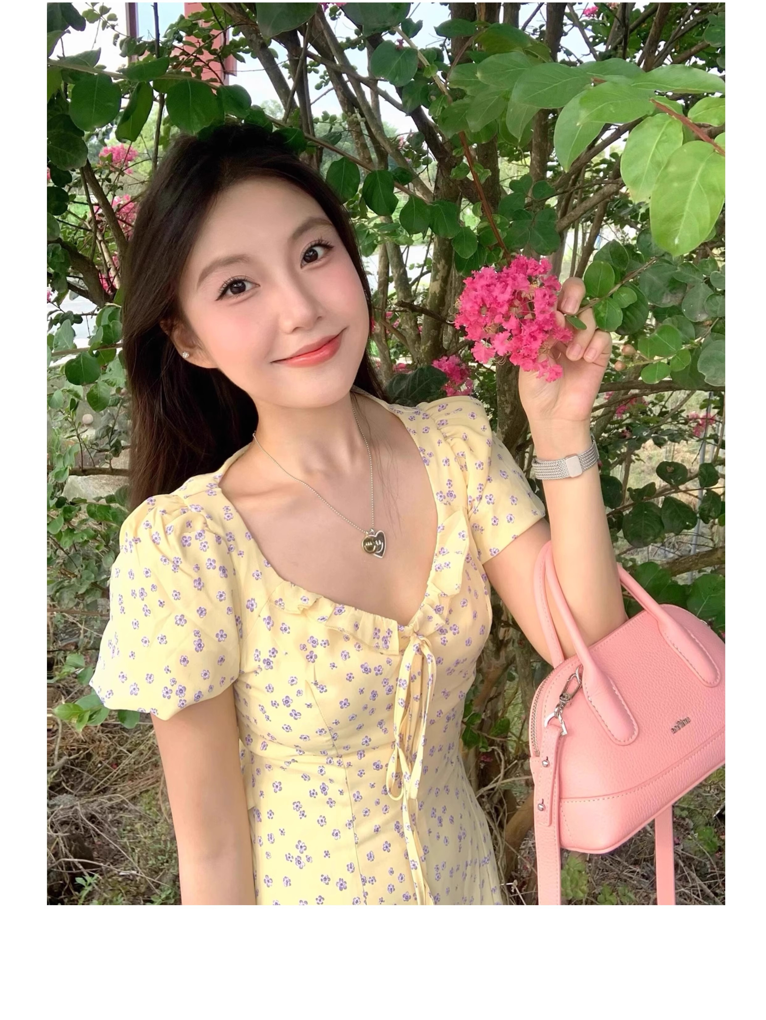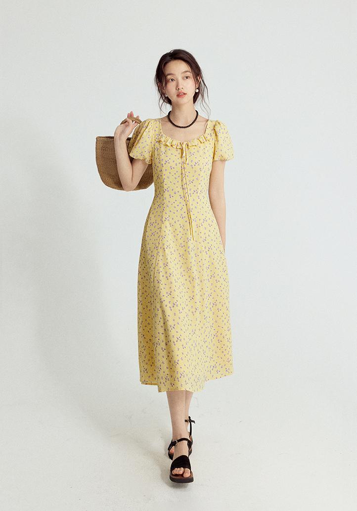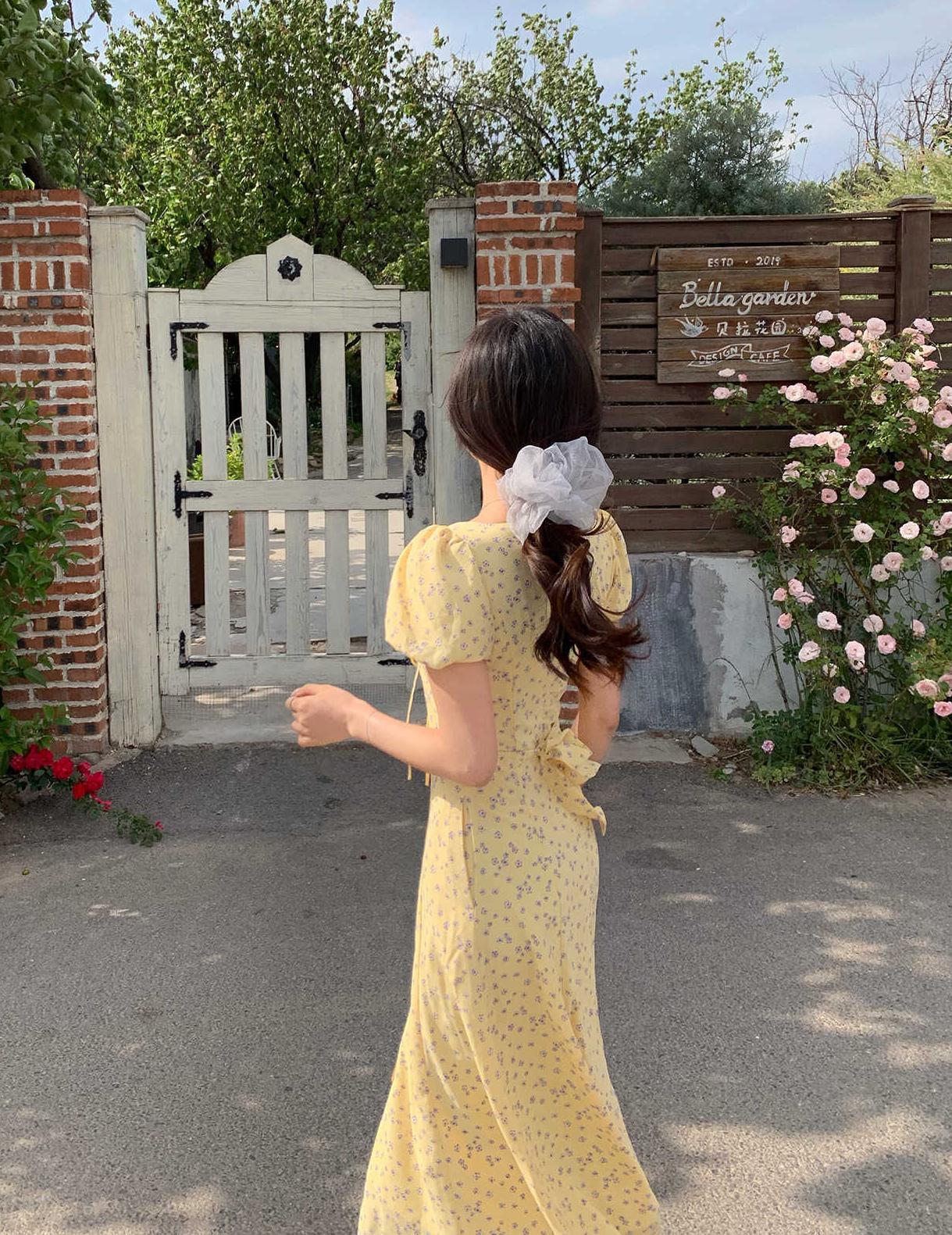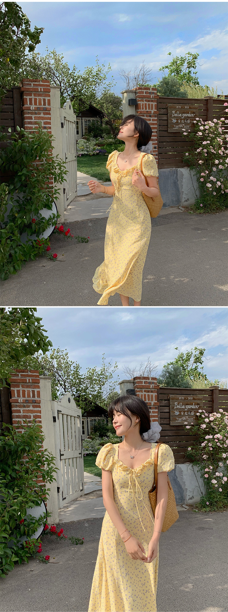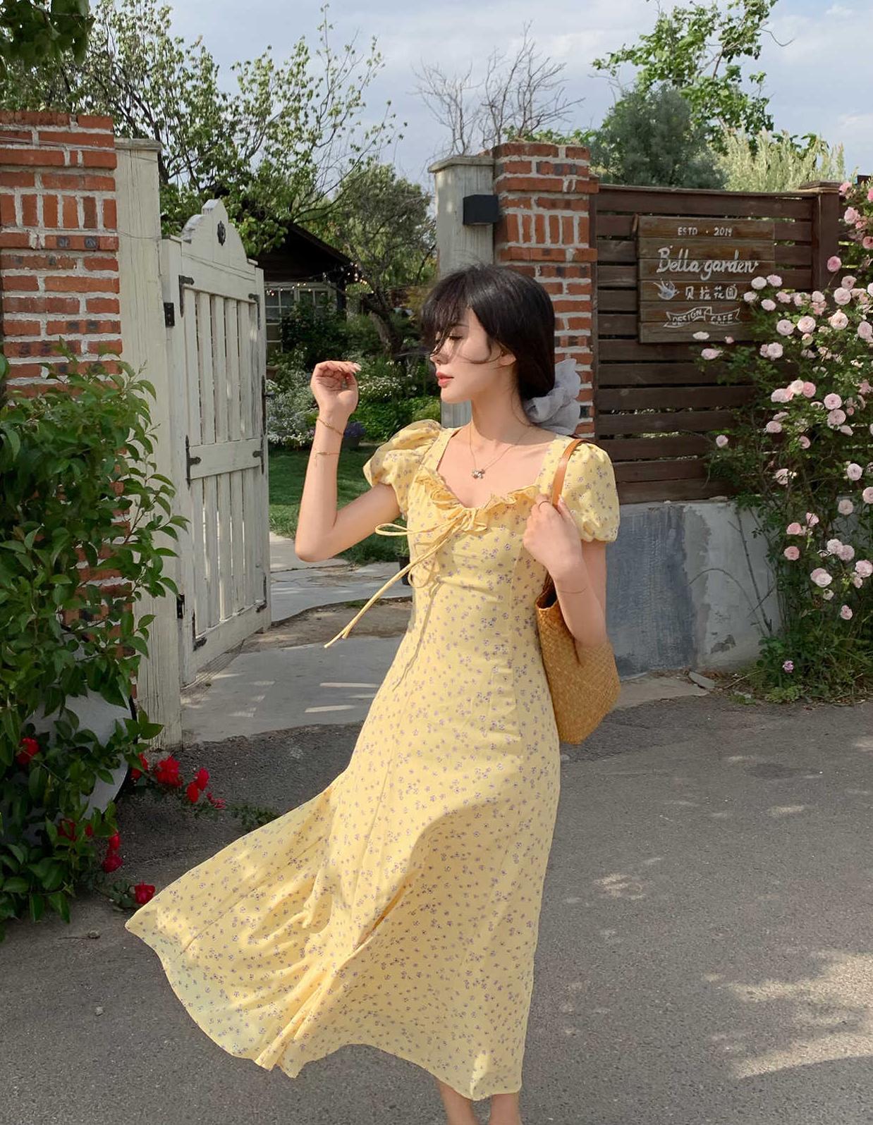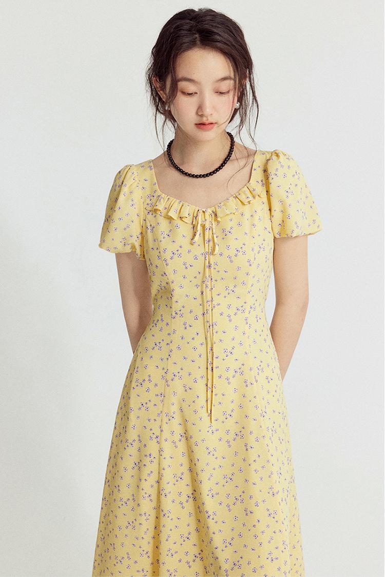 一袭淡黄碎花连衣裙 是春日写给人间的情诗 方领设计恰到好处地露出精致锁骨与修长脖颈 瞬间提升优雅气质 修饰脸型效果也十分出众 腰间的系带,勾勒曼妙身姿 每一步都似摇曳生姿的舞步 凸显身材曲线,打造迷人S型