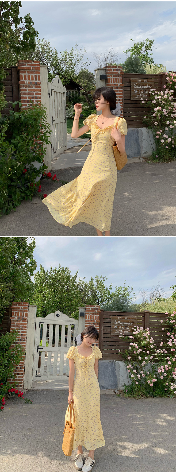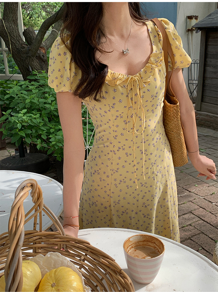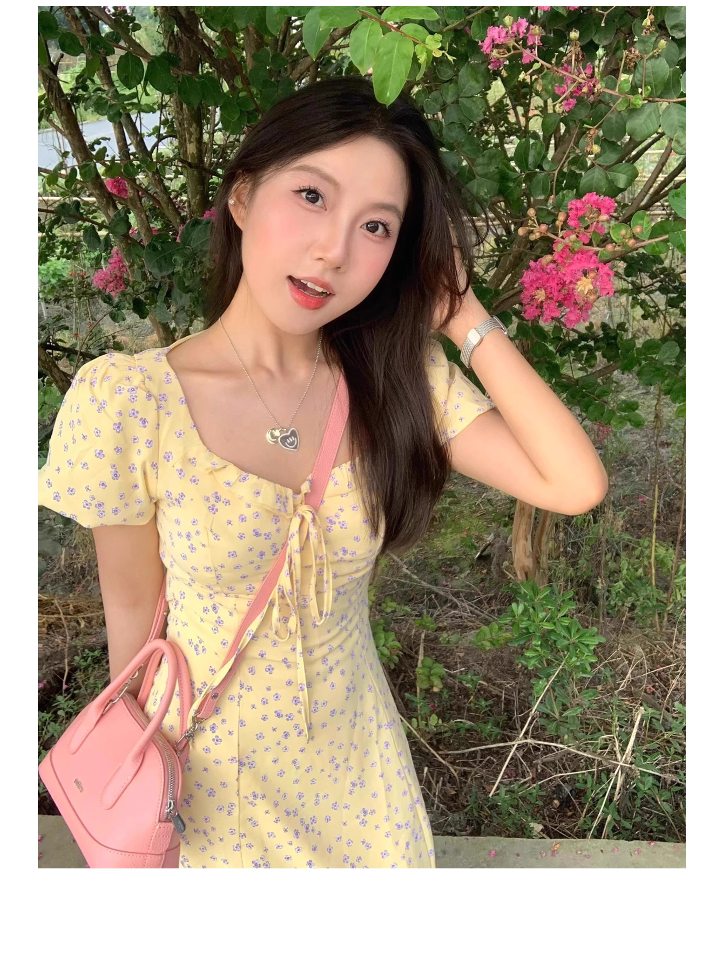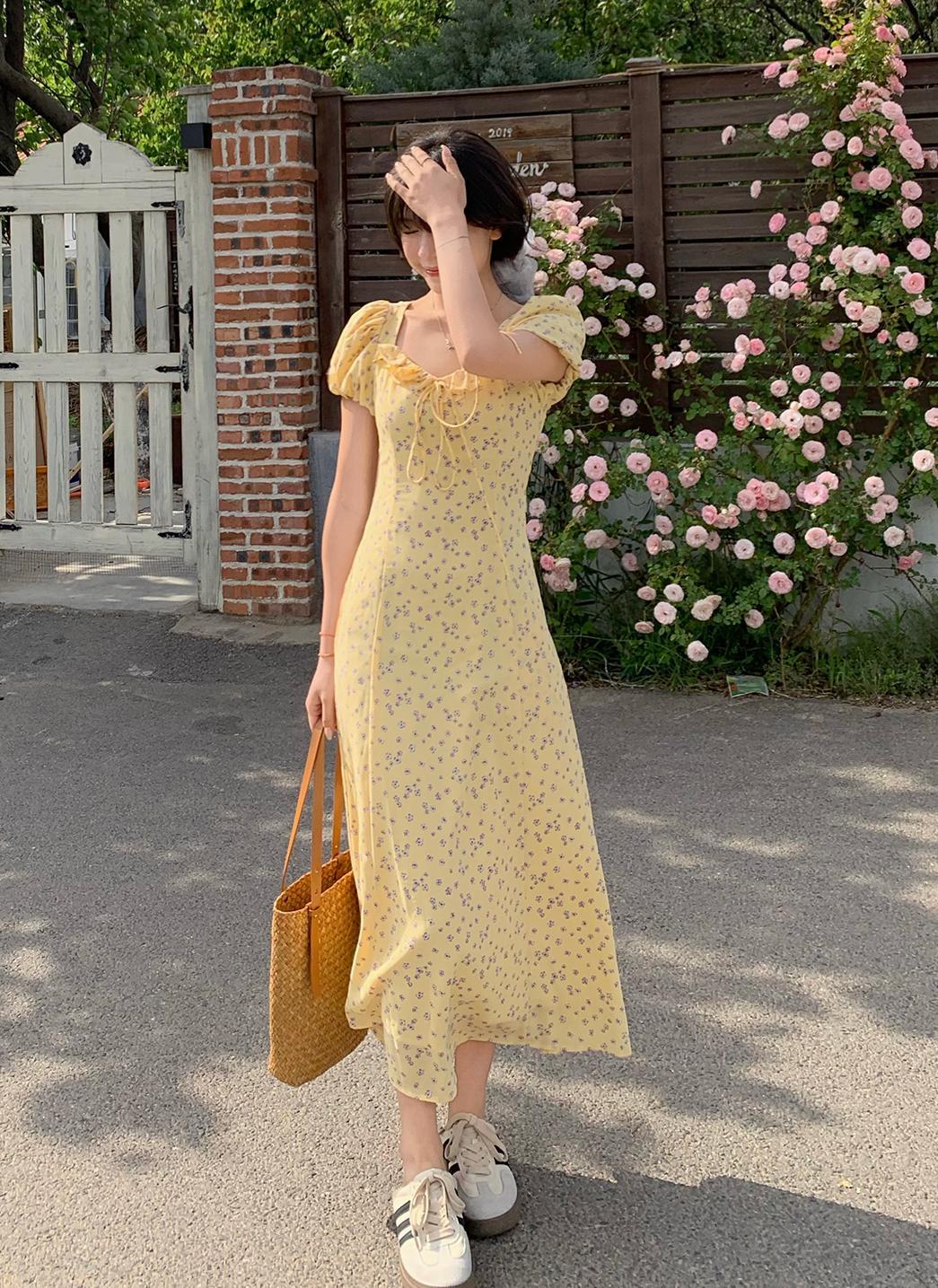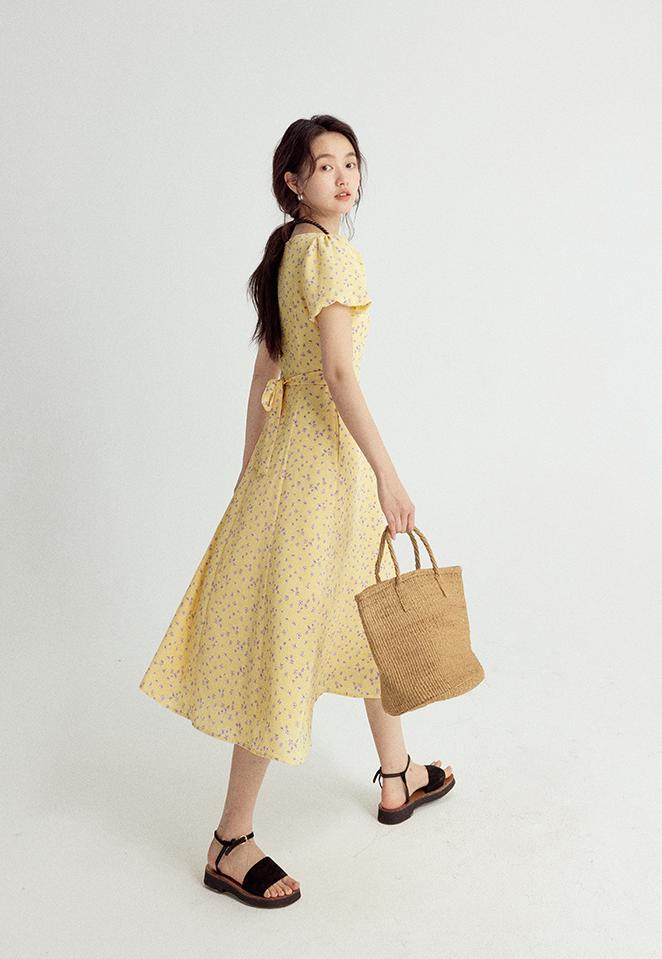 一袭淡黄碎花连衣裙 是春日写给人间的情诗 方领设计恰到好处地露出精致锁骨与修长脖颈 瞬间提升优雅气质 修饰脸型效果也十分出众 腰间的系带,勾勒曼妙身姿 每一步都似摇曳生姿的舞步 凸显身材曲线,打造迷人S型