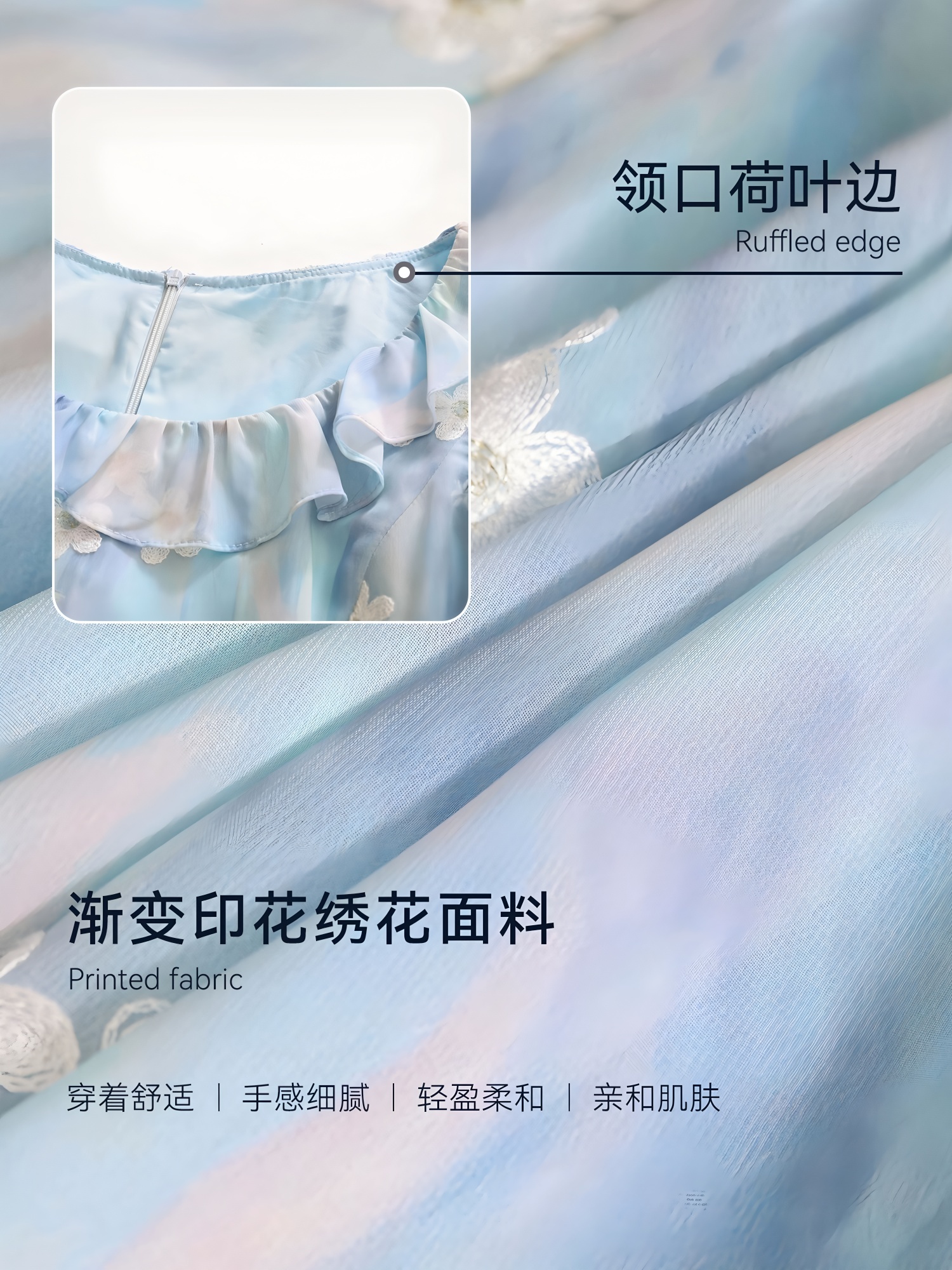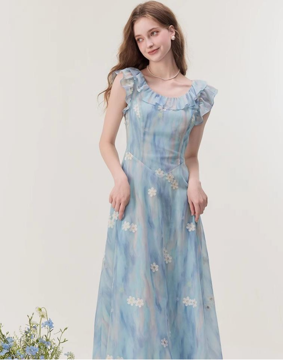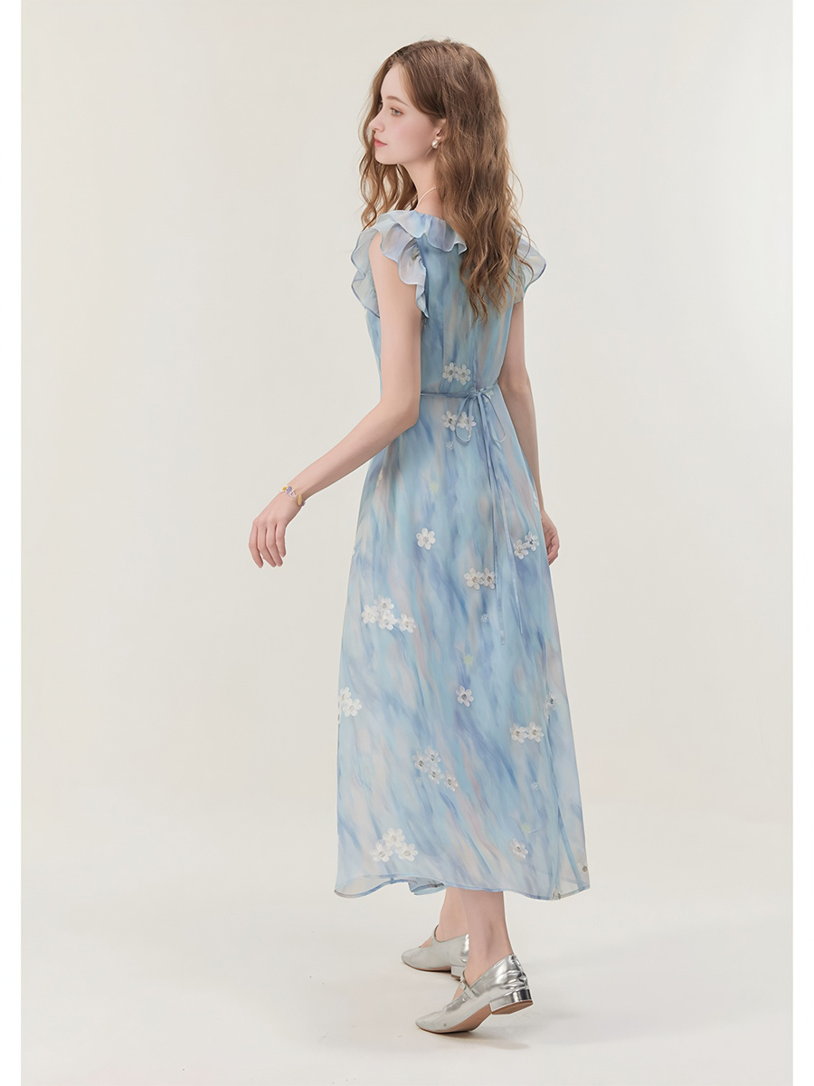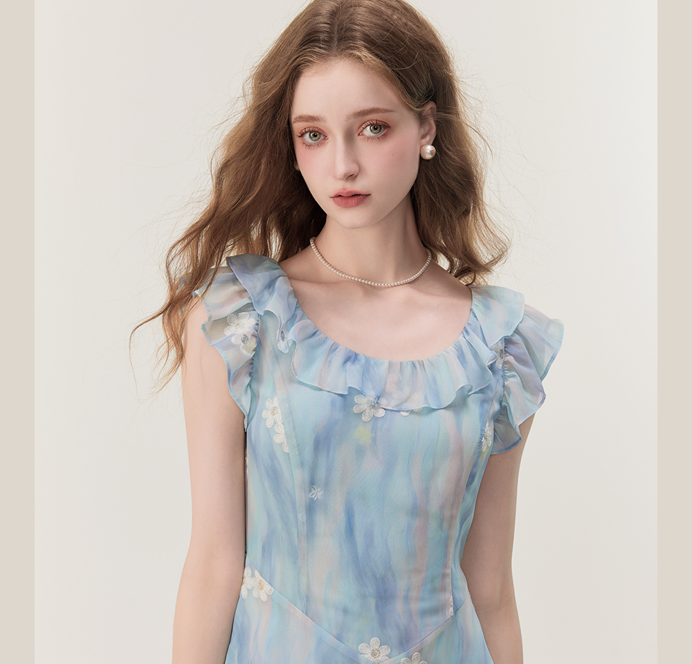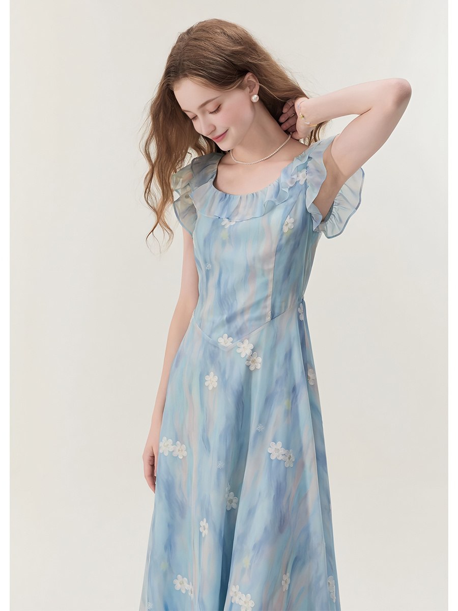 ACUE9061渐变绣花U型领连衣裙:水云蓝