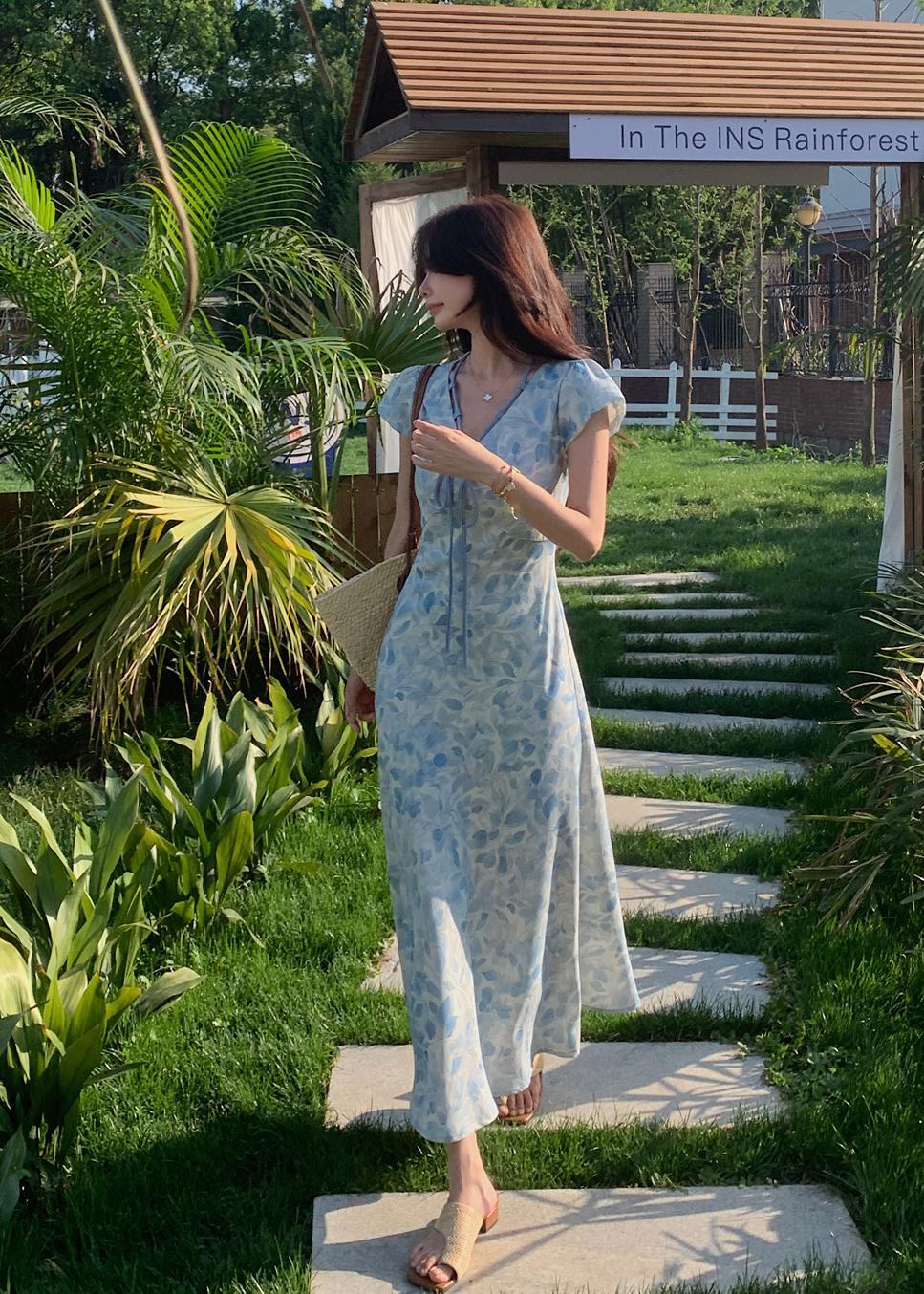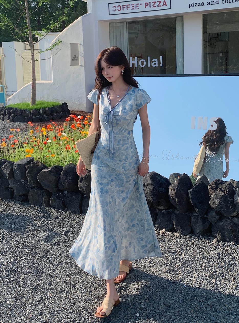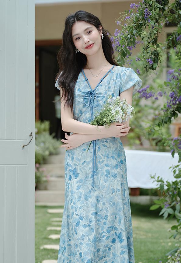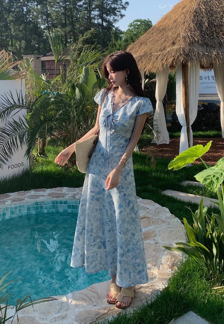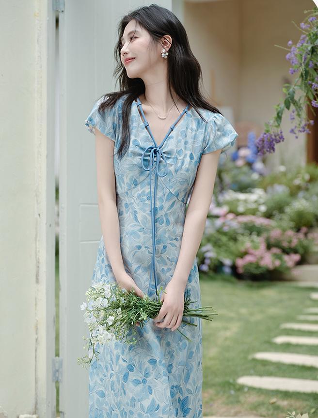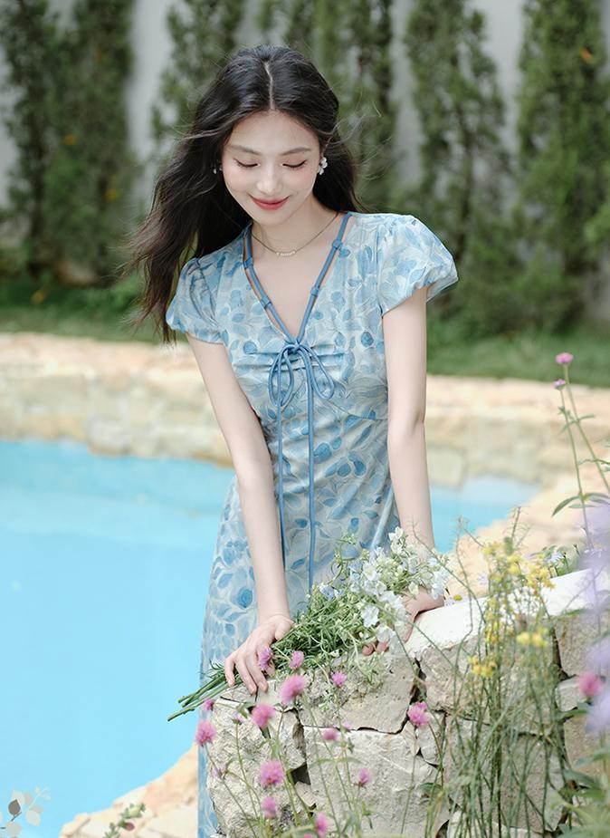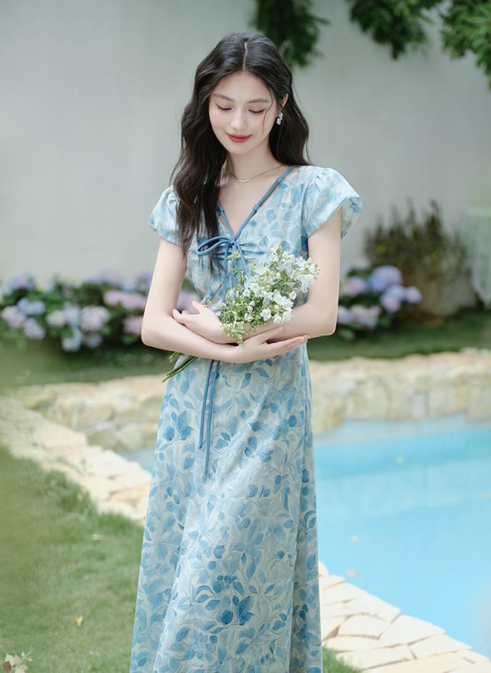 ACUE9060优雅气质显白蓝色印花法式短袖连衣裙,
