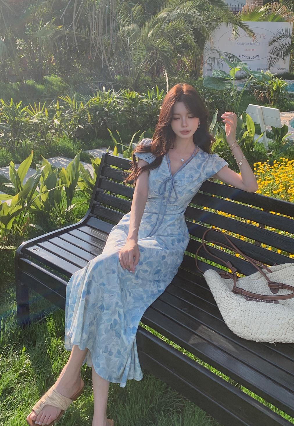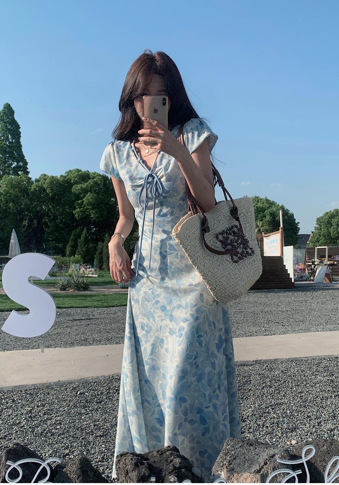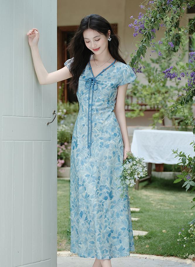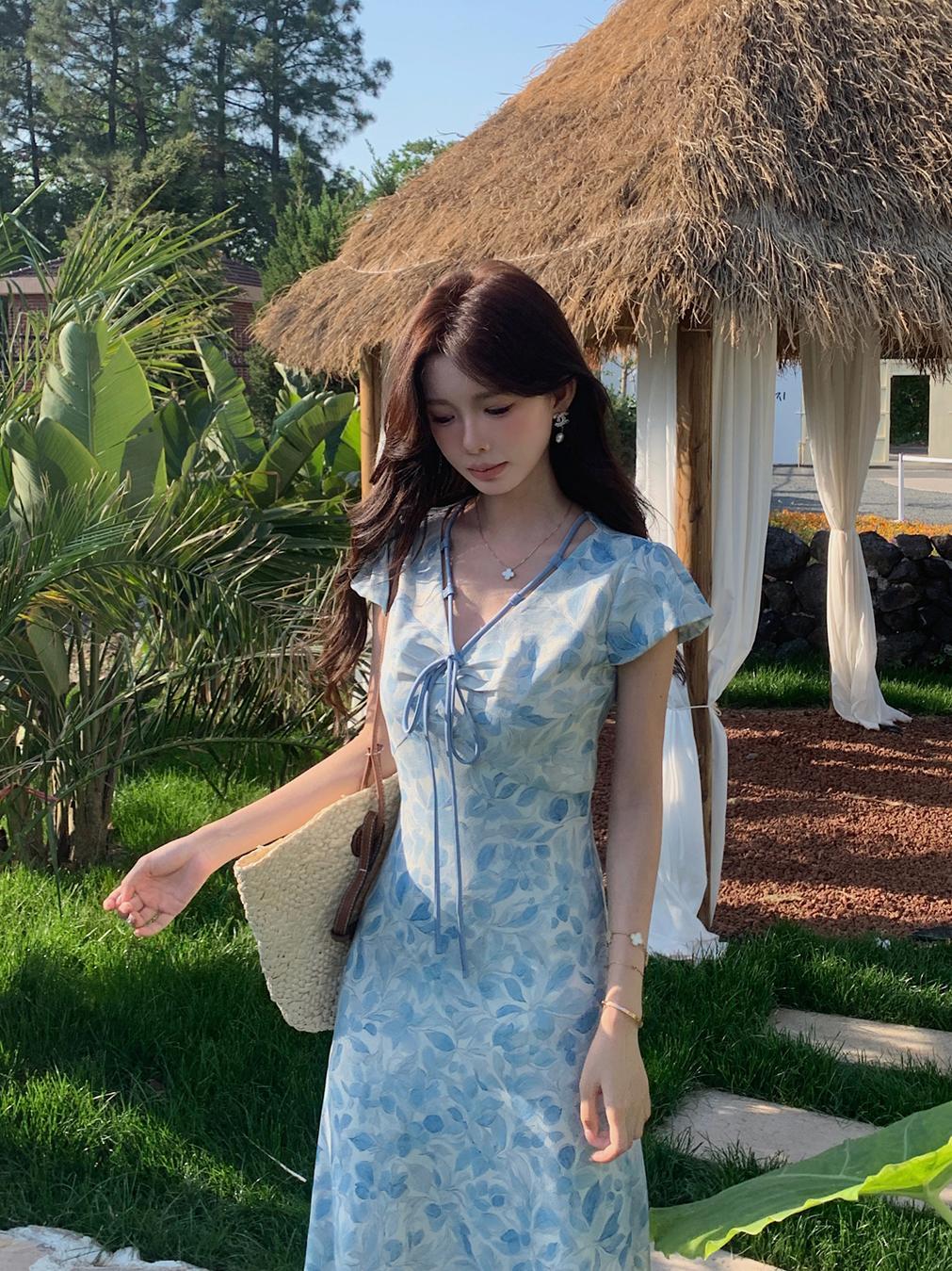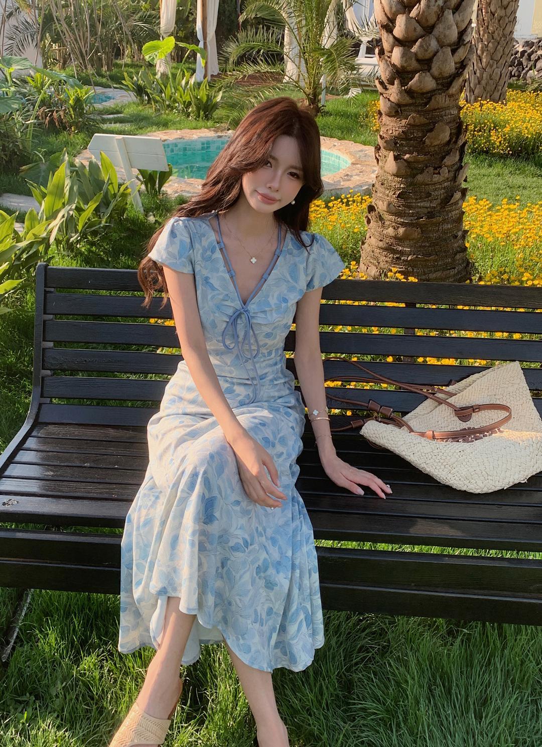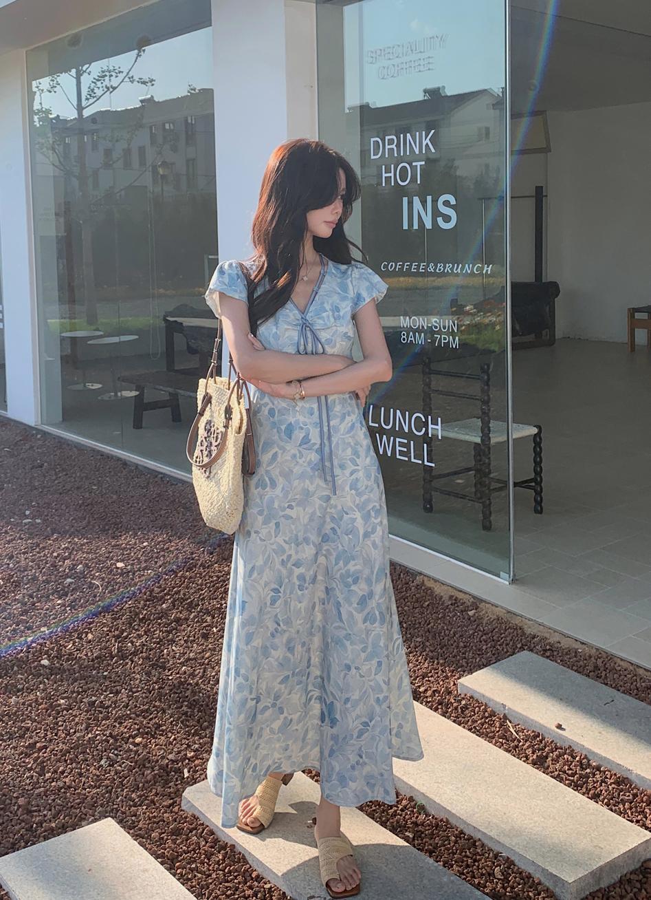 ACUE9060优雅气质显白蓝色印花法式短袖连衣裙,