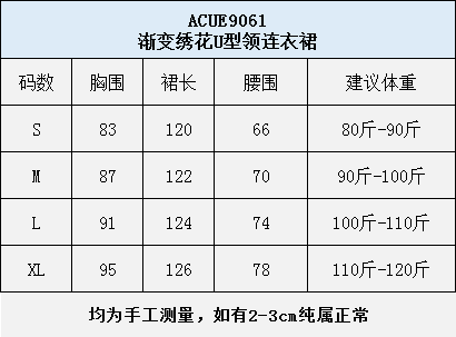 款式四: ACUE9061渐变绣花U型领连衣裙 [材质] 100%涤纶 [颜色]水云蓝 [尺码] S-XL S:裙长120 胸围83 腰围66 (建议80-90斤) M:裙长122 胸围87 腰围70 (建议90-100斤) L:裙长124 胸围91 腰围74 (建议100-110斤) XL:裙长126 胸围95 腰围78 (建议110-120斤)