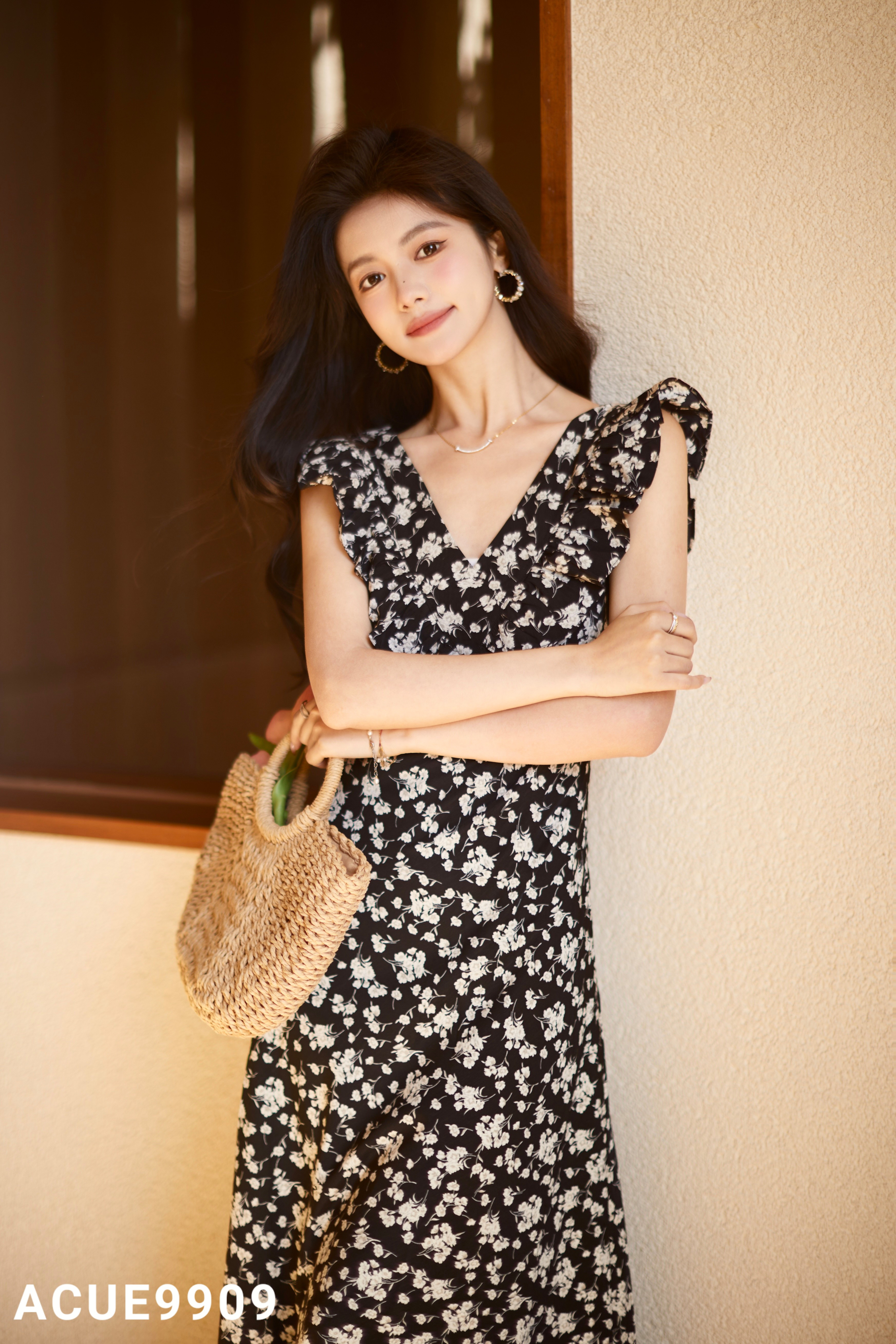 ACUE9909茶歇法式赫本风黑色碎花连衣裙,