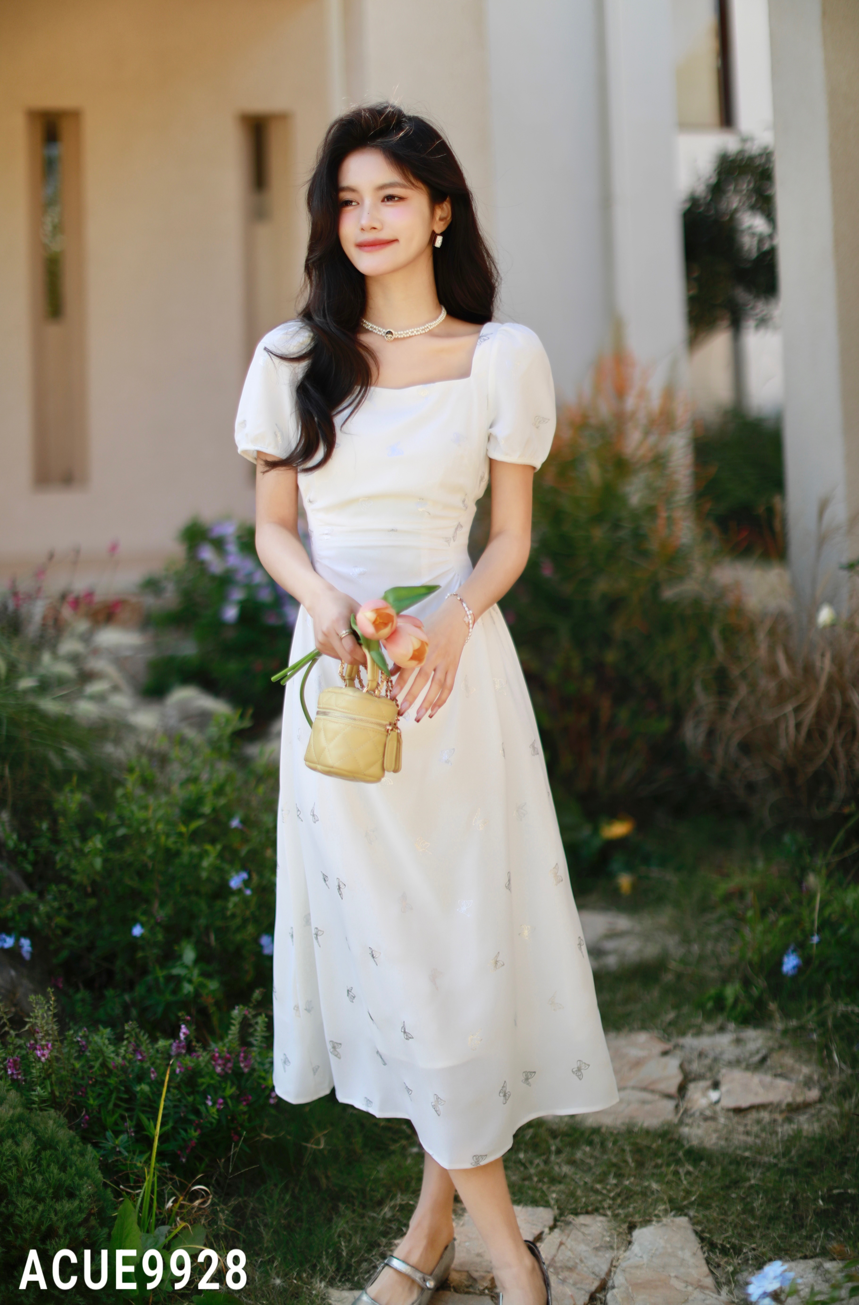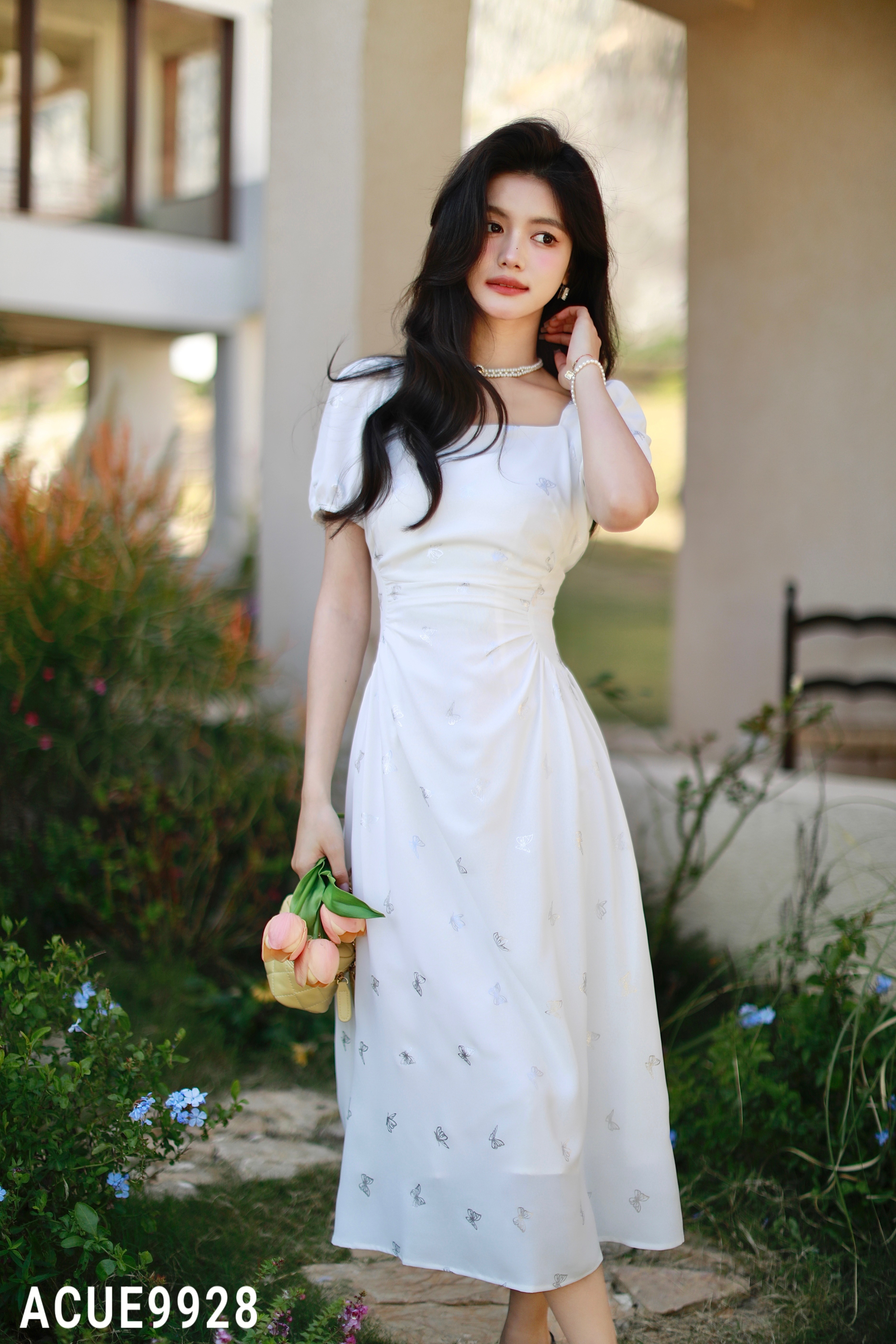 ACUE9928蝴蝶印花修身连衣裙:白色