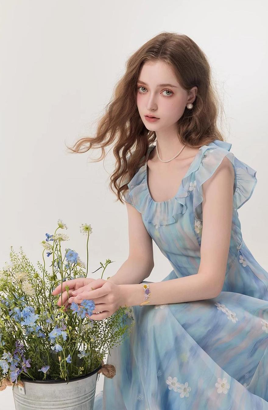 裙子是收腰的 A 字版型 特别贴合腰身轮廓 能把身材曲线勾勒得刚刚好 大裙摆的设计又特别有包容度 不管什么身材穿上都好看 蓝色上身真的巨显白 穿上秒变夏日精致少女