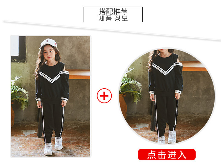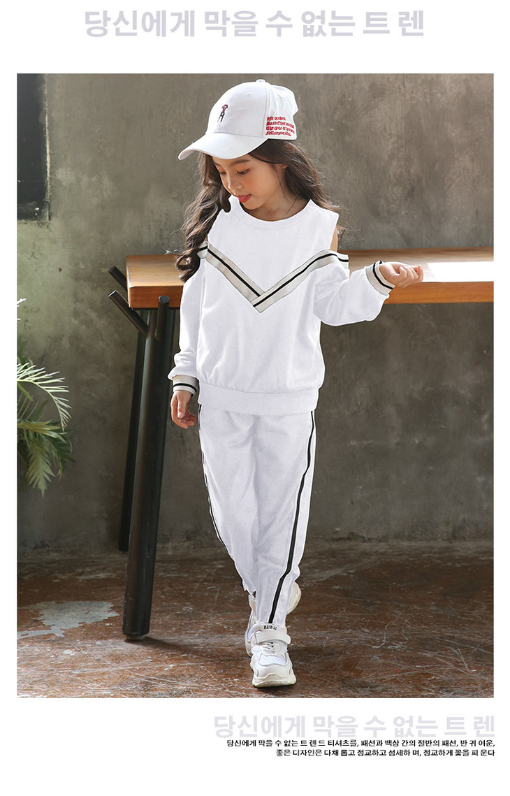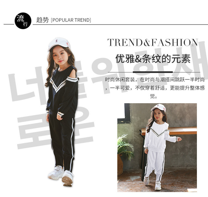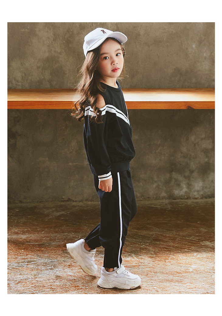 【童装】童装春季新款时尚露肩童卫衣+松紧腰运动裤拼色儿童套装