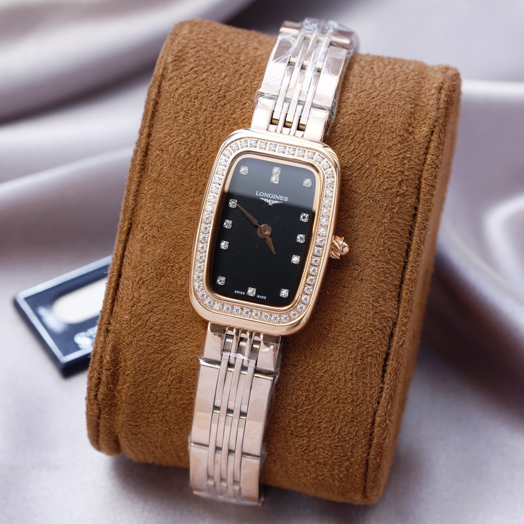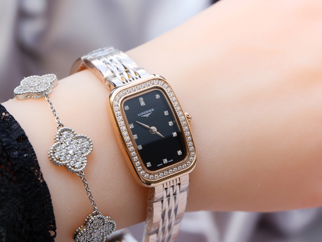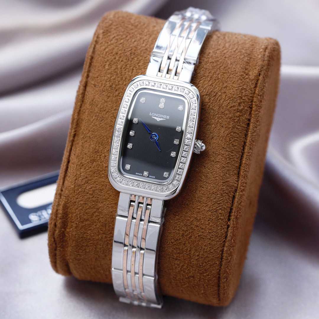 的特质,并以圆角代替尖锐的方形锋角,原装罗旋纹把头、批花精钢表针 十分雅致!上手效果极佳!采用石英进口机芯,圈口镶嵌的钻石晶莹质感 经典罗马面 阿拉伯数字面、双卜桥形玻璃 ,原装浪琴专用按扣…漂亮。