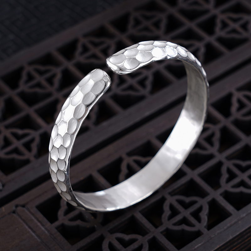 【寓意】:手镯采用锤纹工艺打造,色泽古朴温润,每一道痕迹都蕴含着时光的故事。寓意尽显年华、顺遂平安。