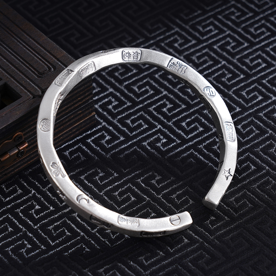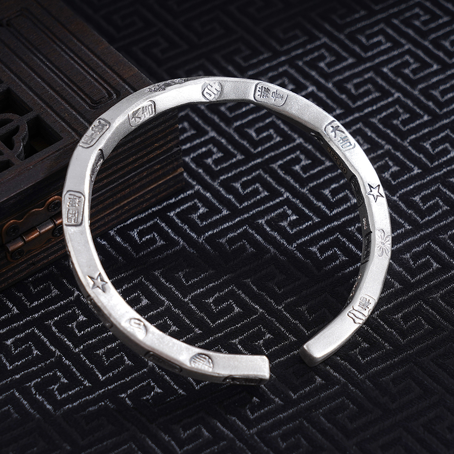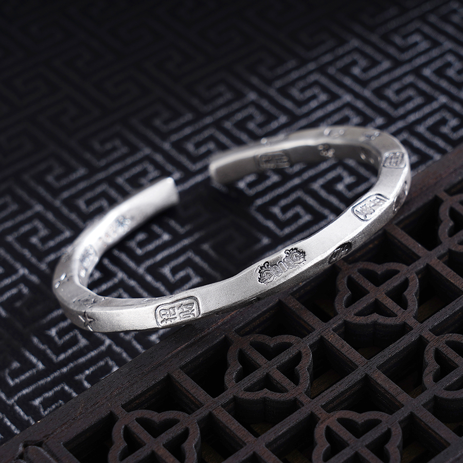【寓意】:纯银开口手镯,镯面錾刻多种吉祥纹样,金刚杵与星月交织,花朵与吉祥文字辉映。佩戴间,能量涌动,吉祥如意随行,福禄常伴左右。