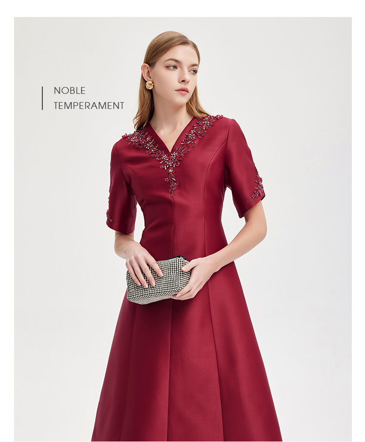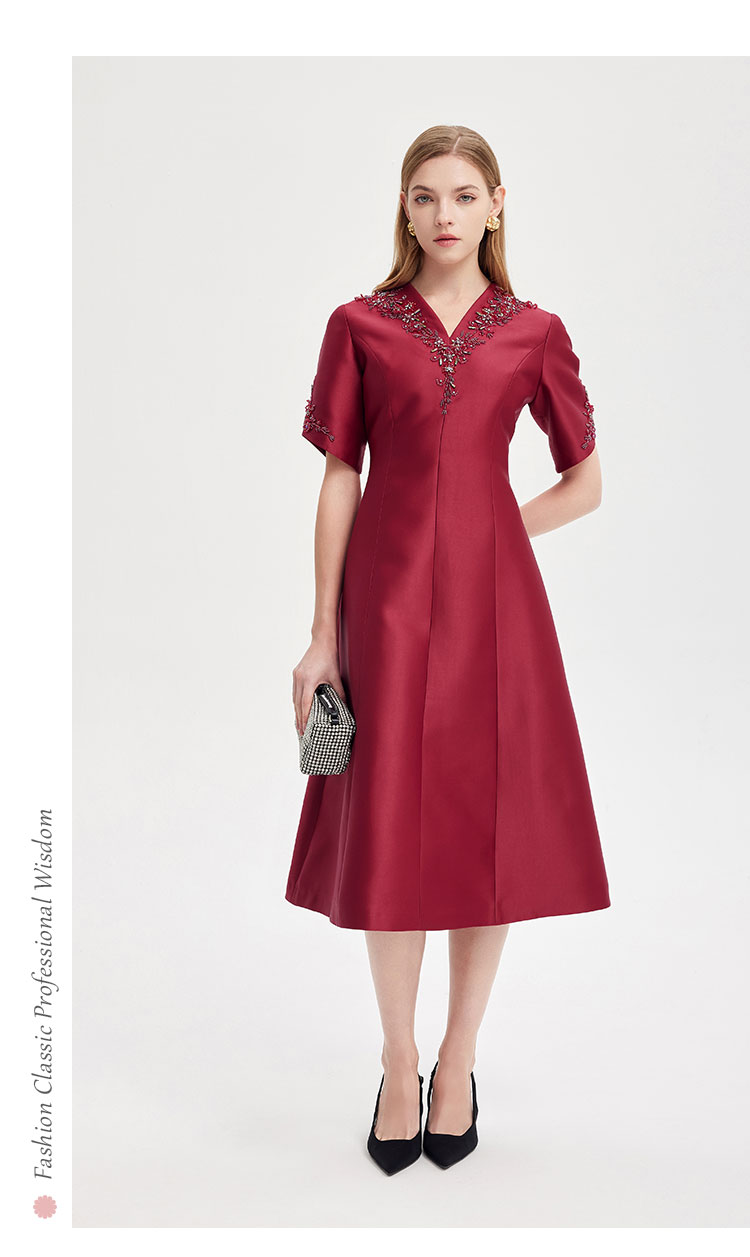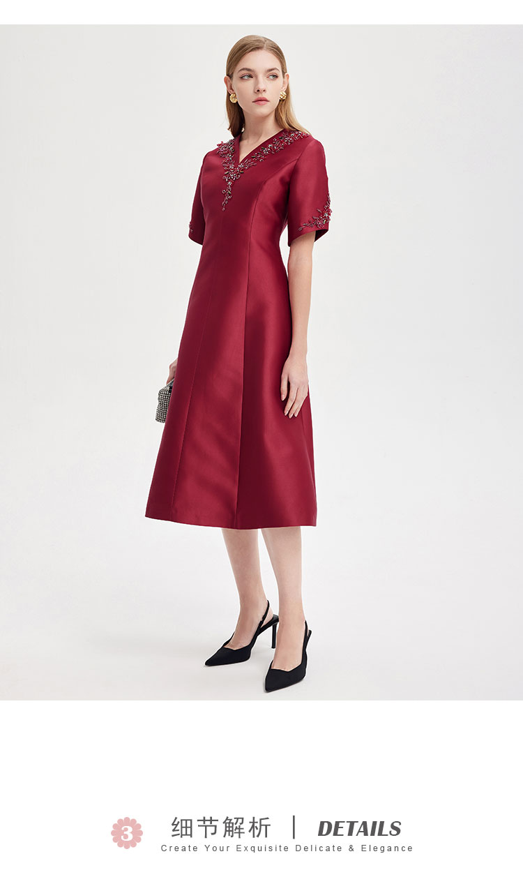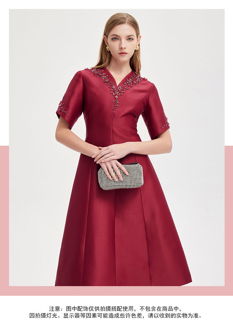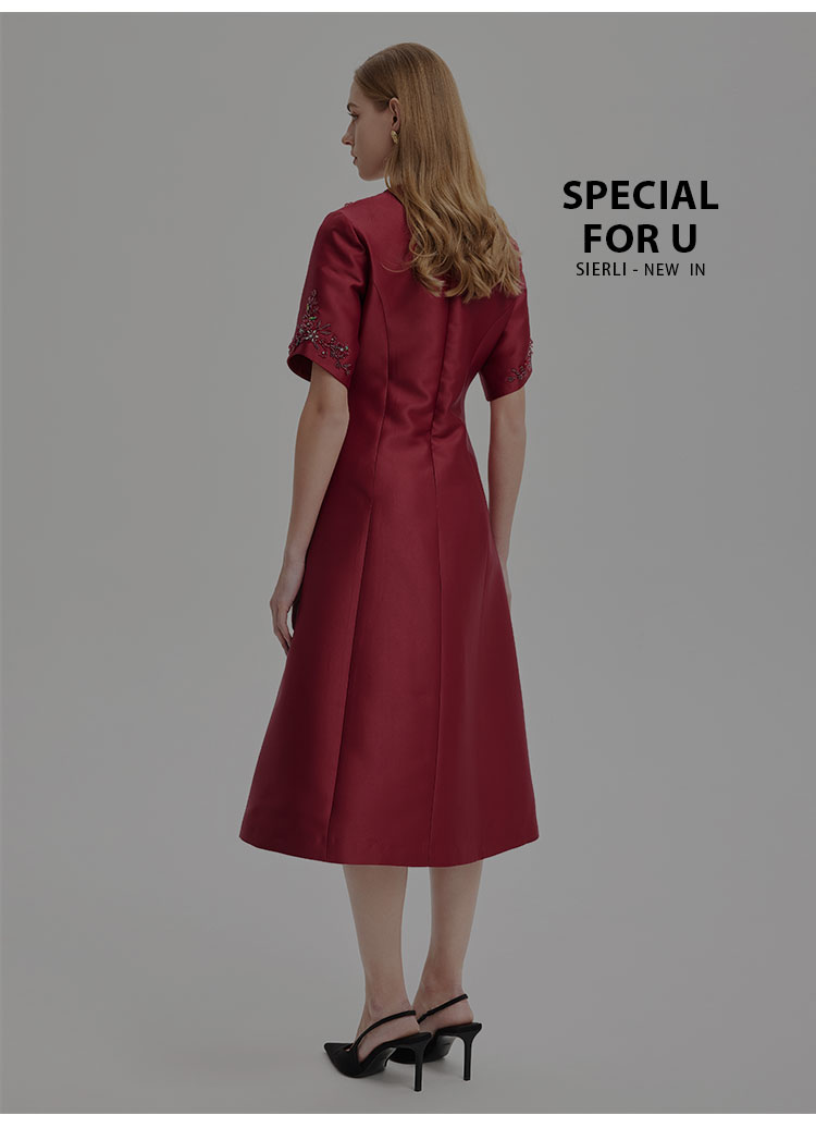 RF8F3斯尔丽2024新款花瓣领型设计感华丽钉珠收腰端庄高贵礼服连衣裙