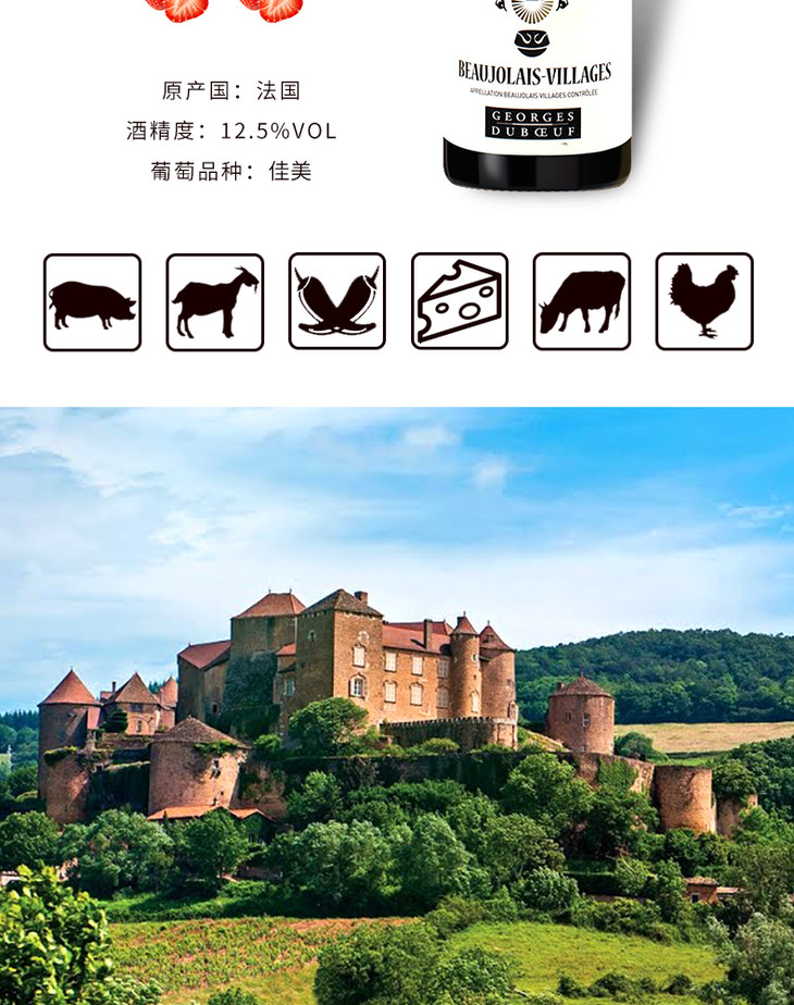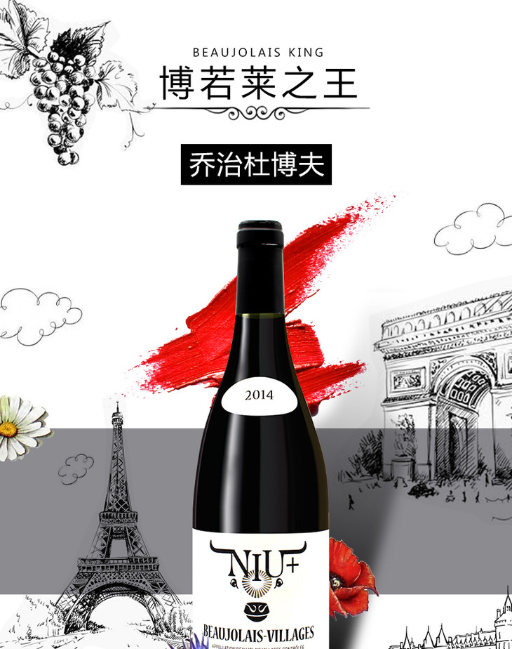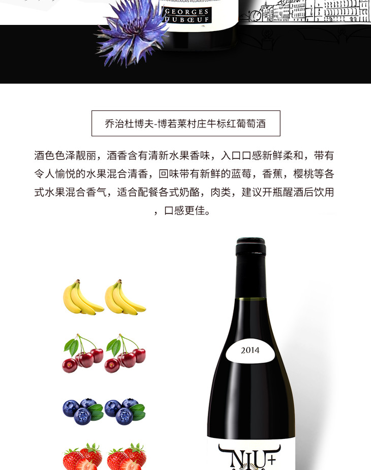 【整箱六瓶】法国原瓶进口红酒 乔治杜博夫博若莱村庄牛标红葡萄酒G. DUBOEUF-BEAUJOLAIS VILLAGES NIU 单支装750ml*6