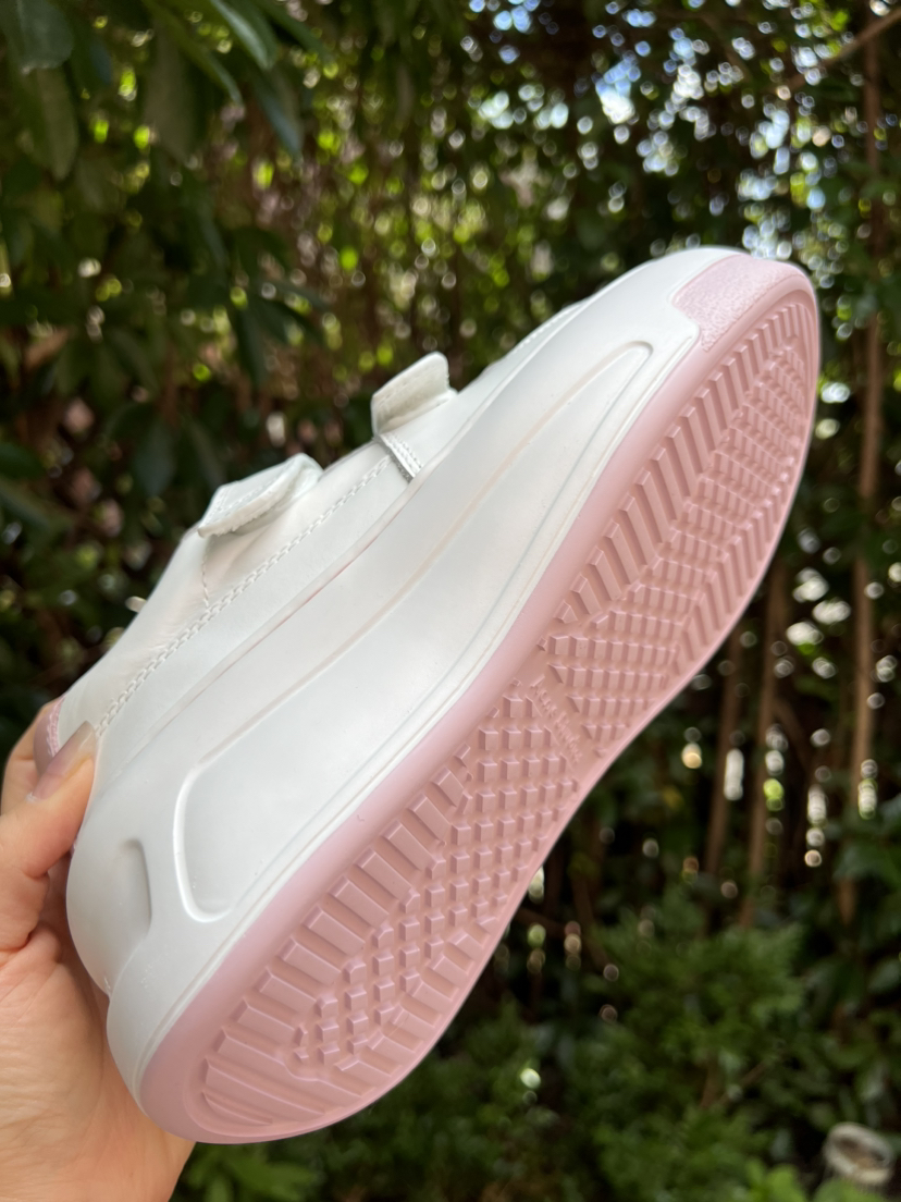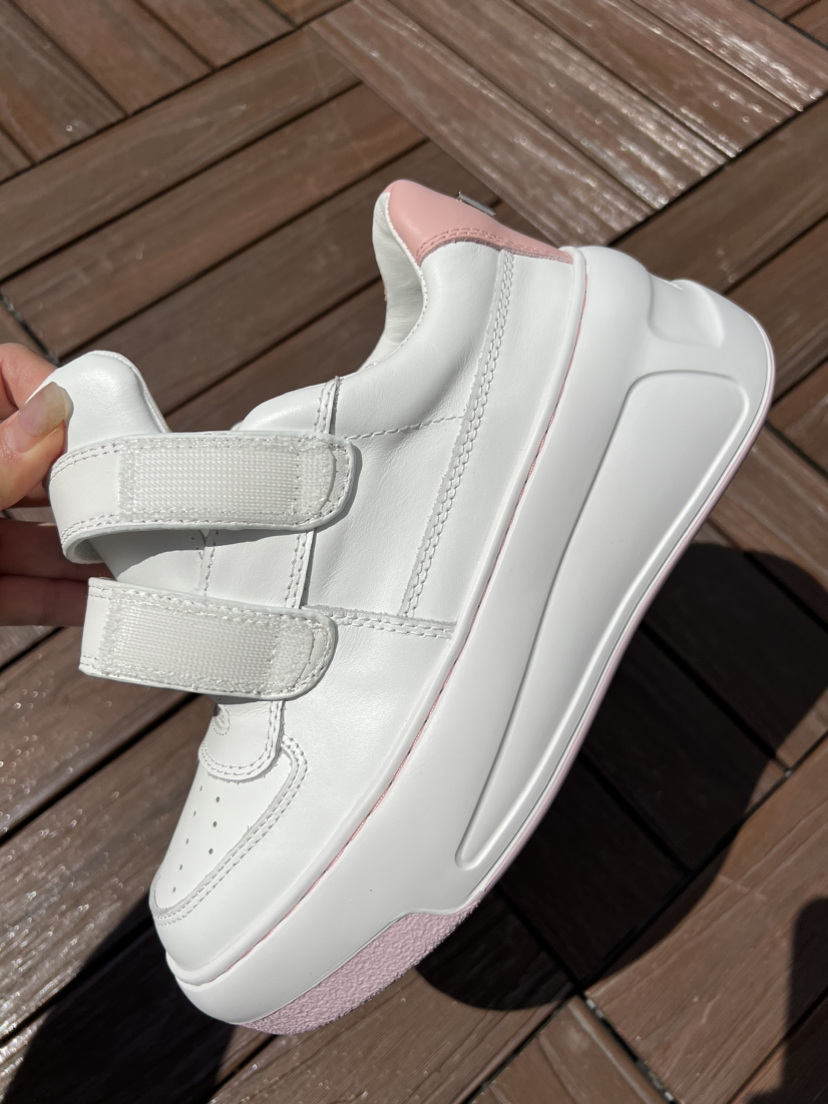头层牛皮材质,纳帕牛皮哦,细腻柔滑到几乎看不到毛孔的头层牛皮,鞋面有透气空,魔术贴开合,踩进去有云端享受。整个内里就是面包厚底小白鞋一样,软软糯糯,亲肤舒适的不得了。