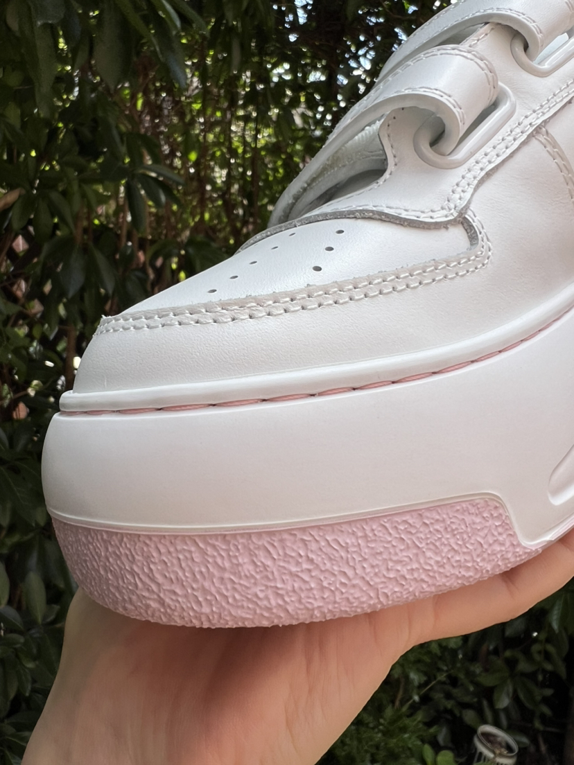 你们关心的两个问题,面包厚底增高版小白鞋,重不重。真的超轻,居然比常规版还要轻便。常规版是热塑聚氨酯,面包厚底增高版,是乙烯-醋酸乙烯酯,摁下去Q弹软糯,回弹力十足,轻便也是更为轻便。