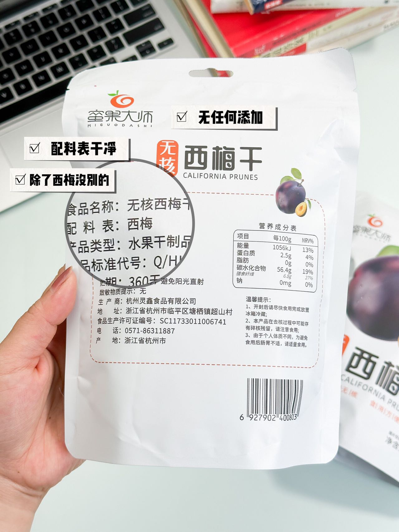 好西梅,梅添加:加州无核西梅干的配料表超级简单,就只有西梅。吃起来保留着原始风味,自然纯净,一家老小都能放心了吃