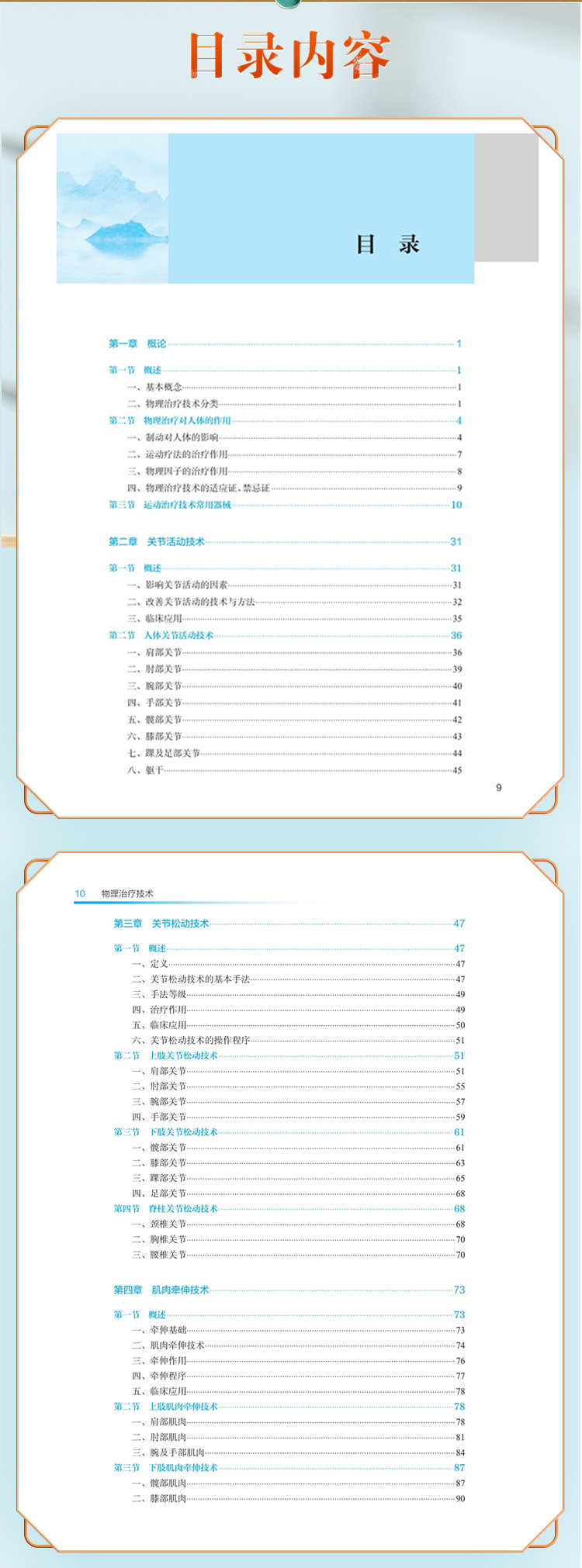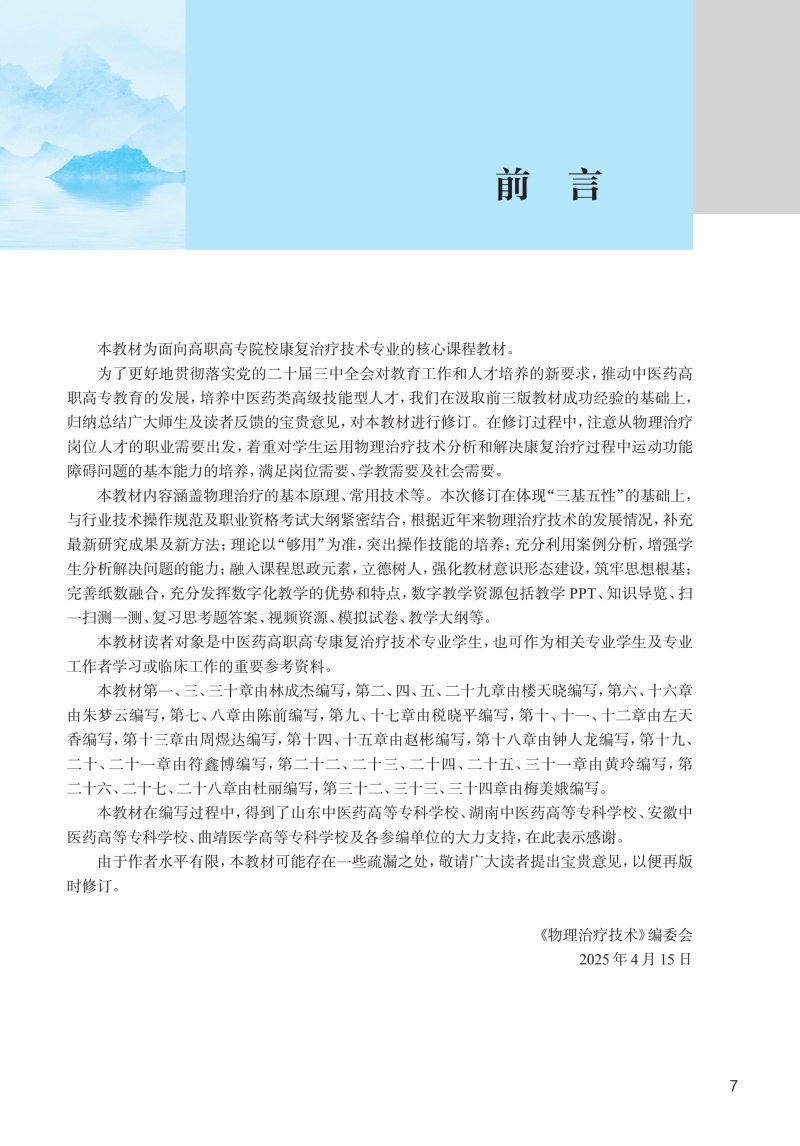 本教材在修订过程中,注意从康复治疗技术专业物理治疗岗位高端技能型人才的职业需要出发,着重体现对学生运用物理治疗技术分析和解决康复治疗过程中运动功能障碍问题的基本能力培养,突出课程的基本要求和人才培养的实用性。本次修订在体现“三基五性”的基础上,与行业技术操作规范及职业资格考试大纲紧密结合,根据近年来物理治疗技术的发展情况,补充**研究成果及新方法;理论以“够用”为准,突出操作技能的培养;充分利用案例分析,增强学生分析解决问题的能力。为增加学习实用性,本次修订完善了数字教学资源,包括知识导览,扫一扫、测一测,教学PPT、课后思考题答案、视频资源、模拟试题等。