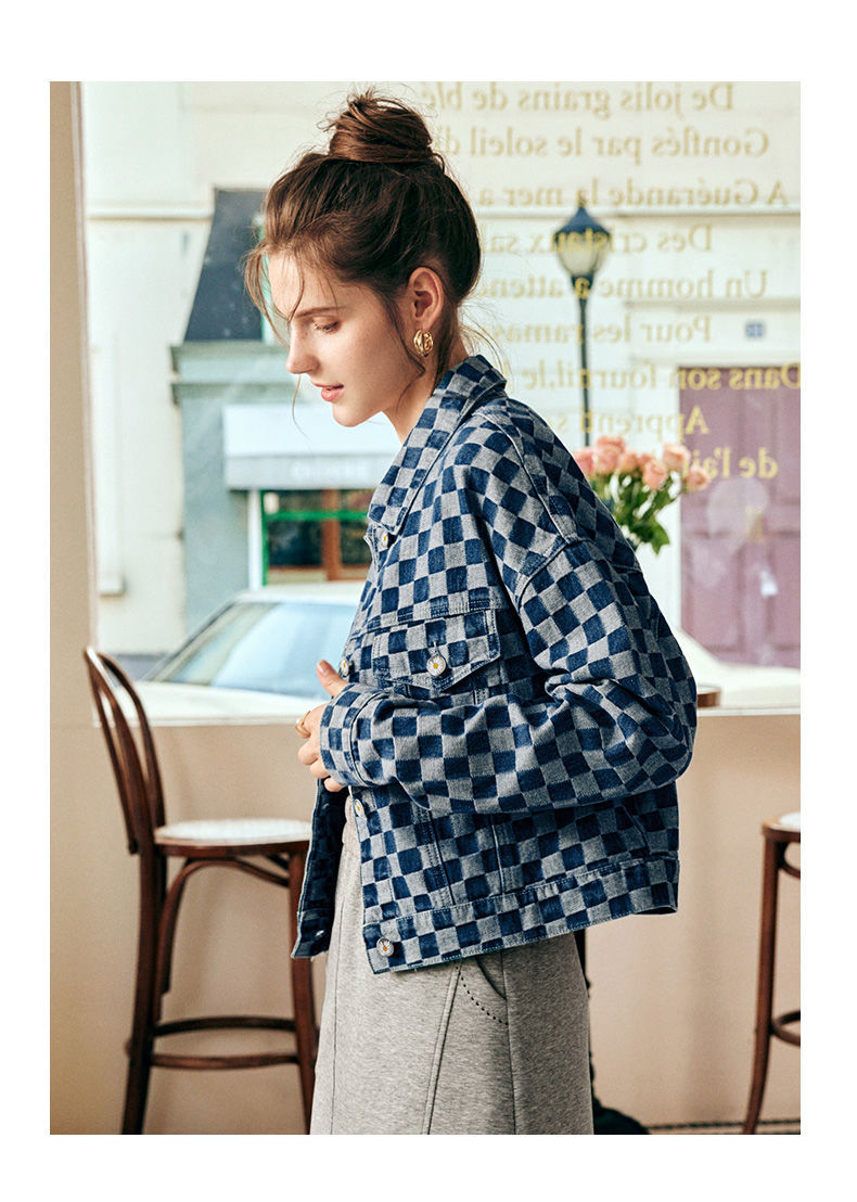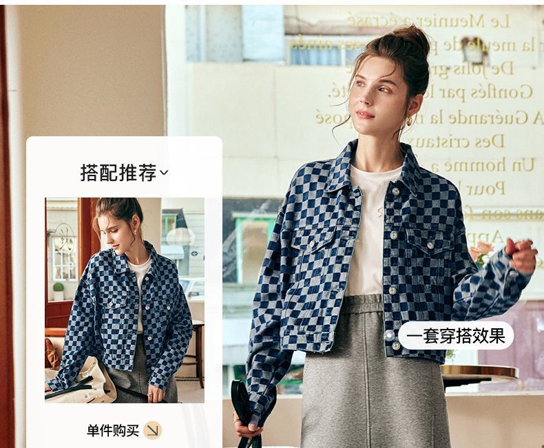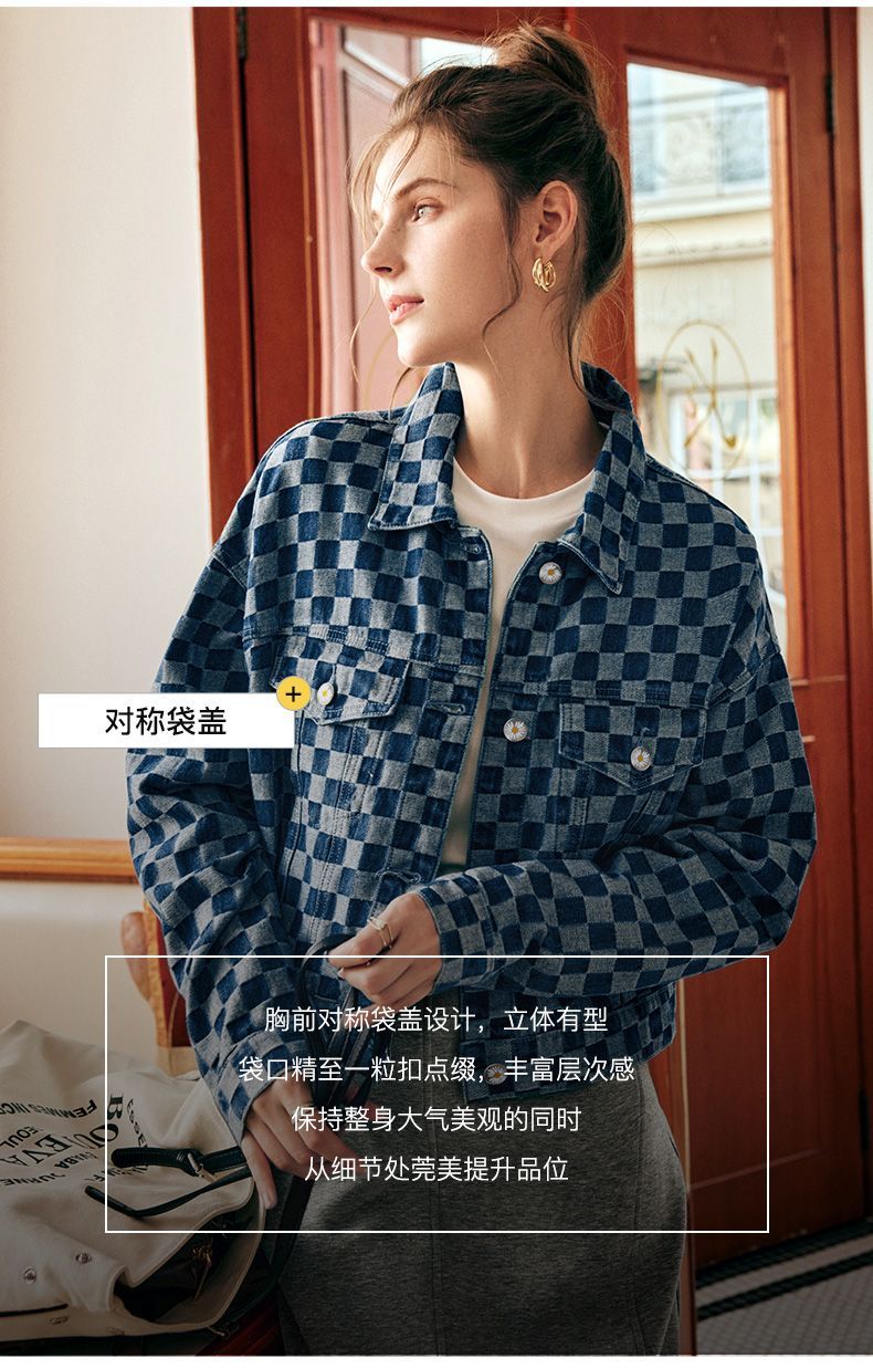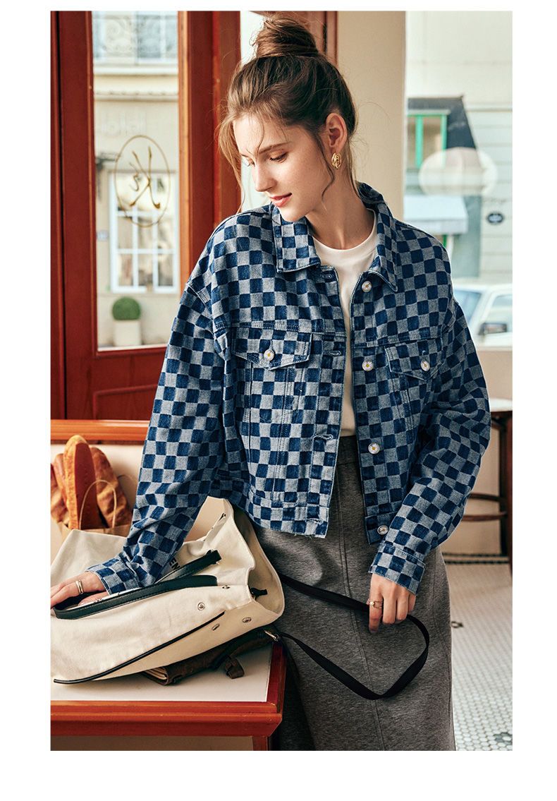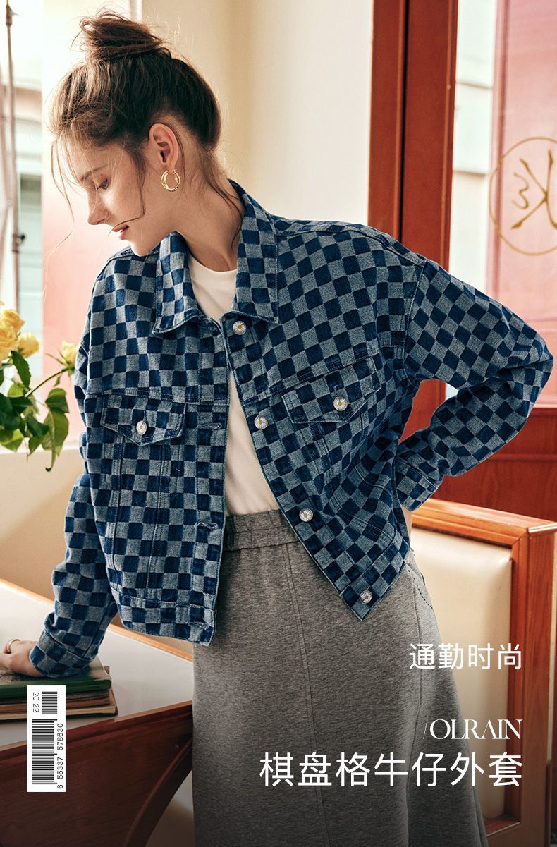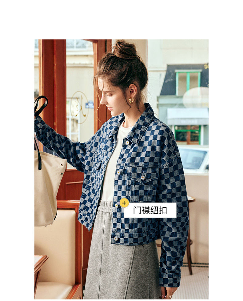 OLrain欧芮儿法式棋盘格牛仔外套女秋季2022年新款复古小个子上衣