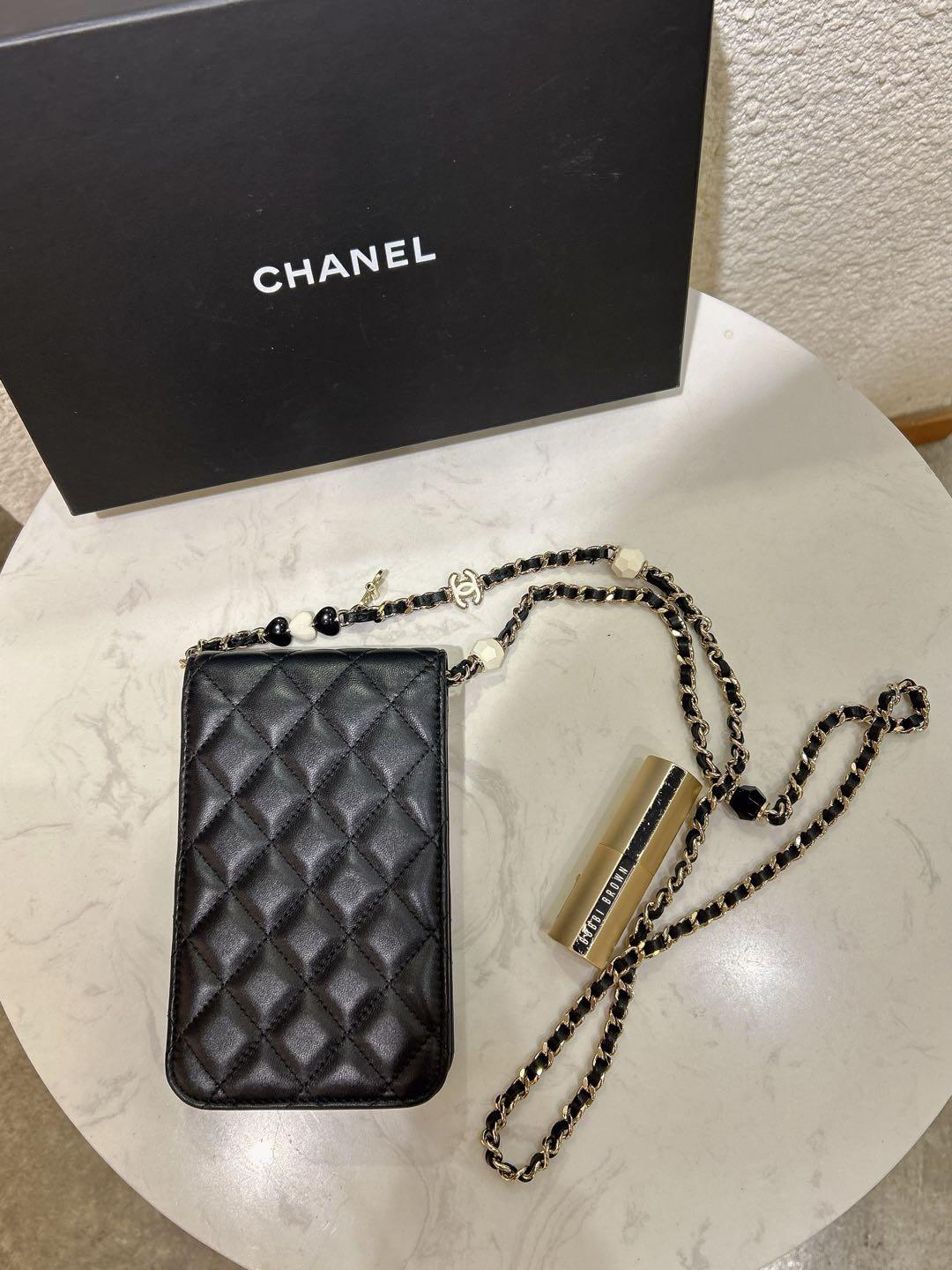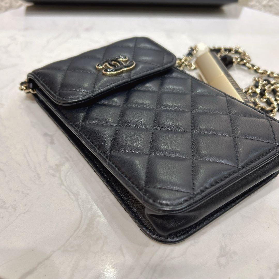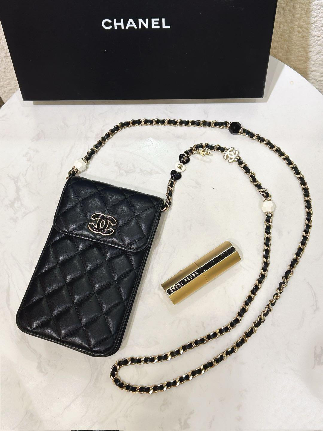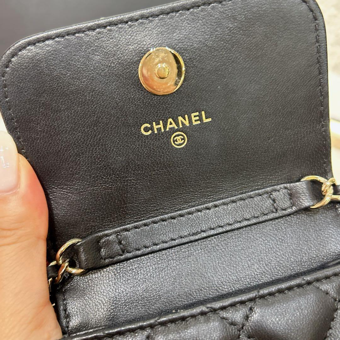【商品詳情】正品二手 Chanel 23p 黑色 羊皮 珐琅扣 爱心 手机包🍰 97新 10x17 新镭射 配件:防尘袋 盒子。少女俏皮
