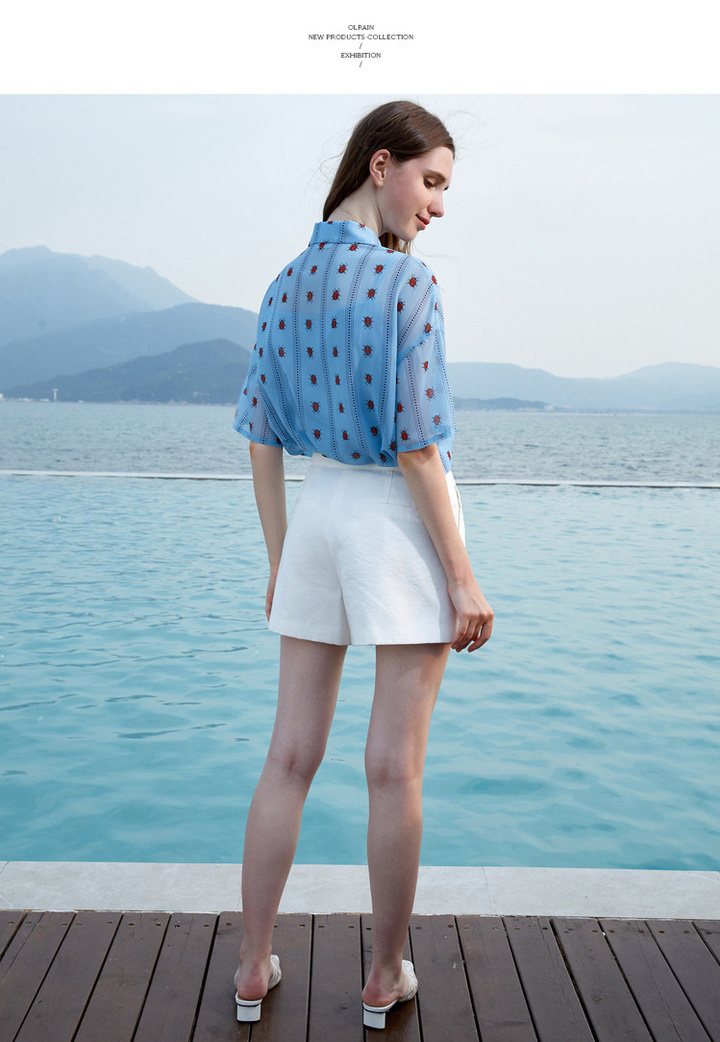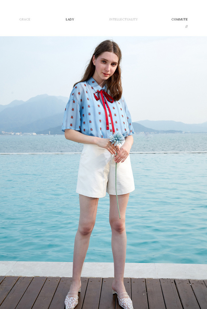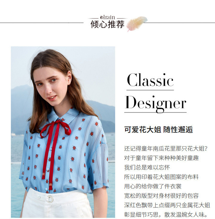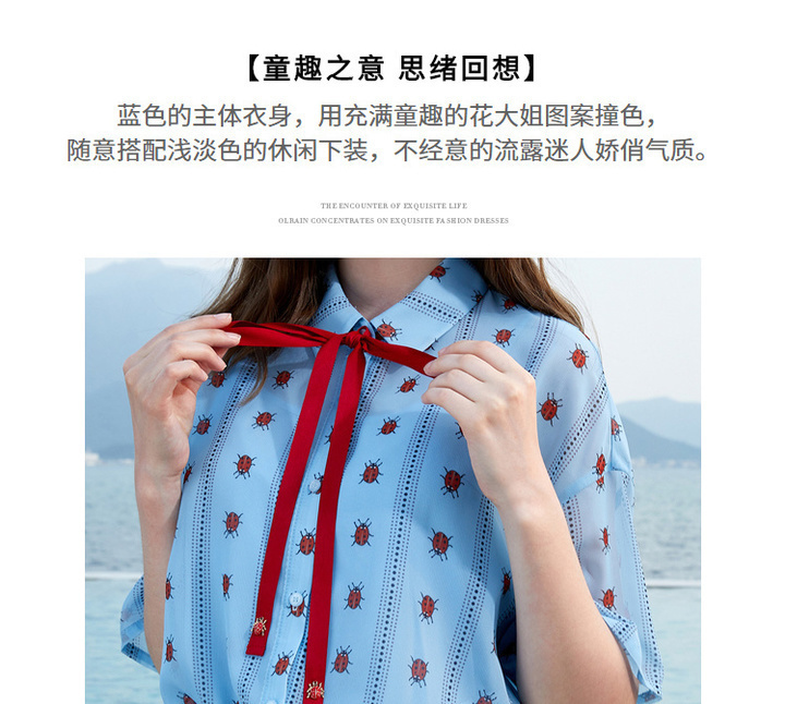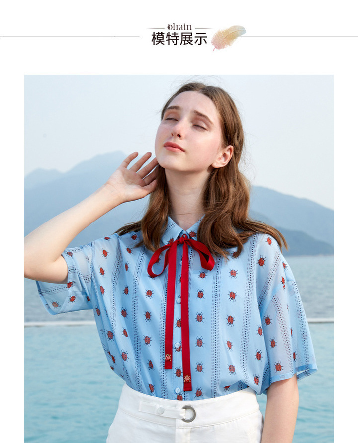 OLrain法式高级穿搭波点领衬衫女夏季2022宽松蝴蝶结撞色衬衣