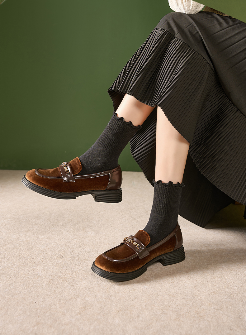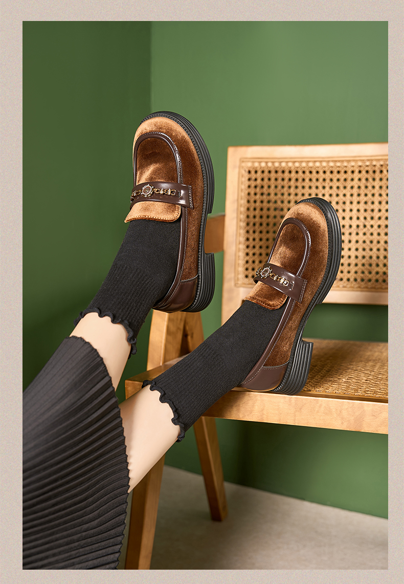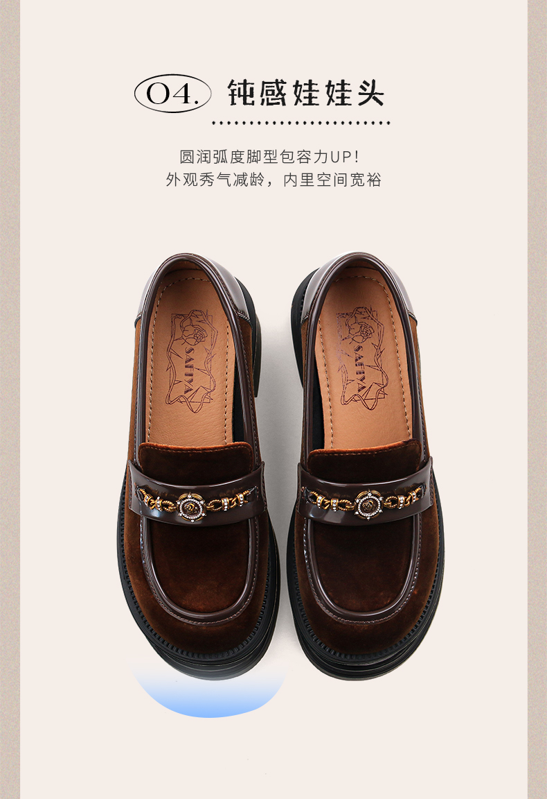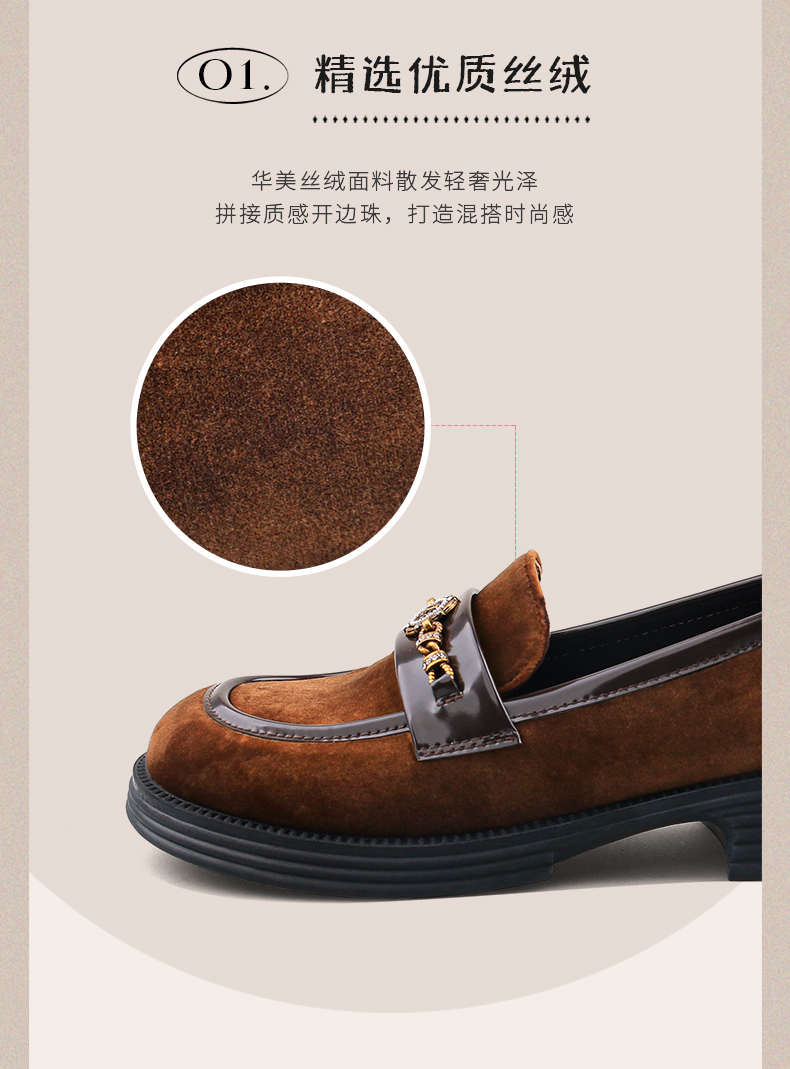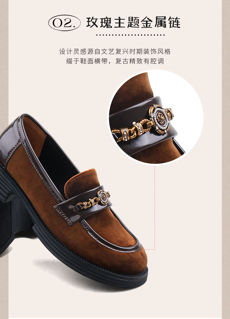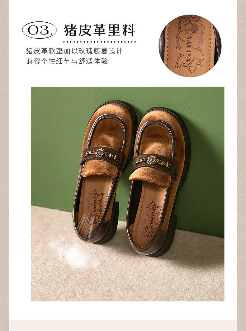 Safiya/索菲娅2024秋学院风复古丝绒玫瑰扣百搭圆头低跟乐福鞋 SF43112150