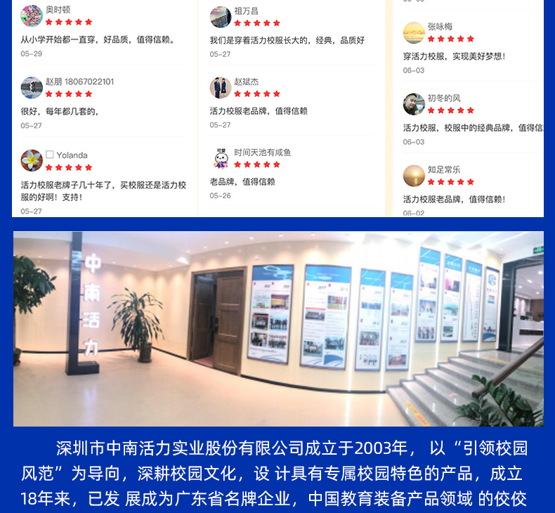 活力校服由深圳市中南活力实业股份有限公司创建的品牌,深圳二十一年老品牌,教育局中标企业;主营深圳校服、广州校服、东莞校服、佛山校服、肇庆校服、江苏校服、鞋袜、学生床上用品等学生课桌椅一站式教育领域产品
