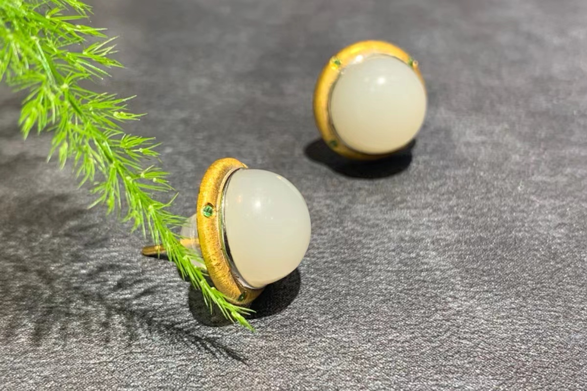 【御珠宫坊】金镶羊脂白玉耳钉
