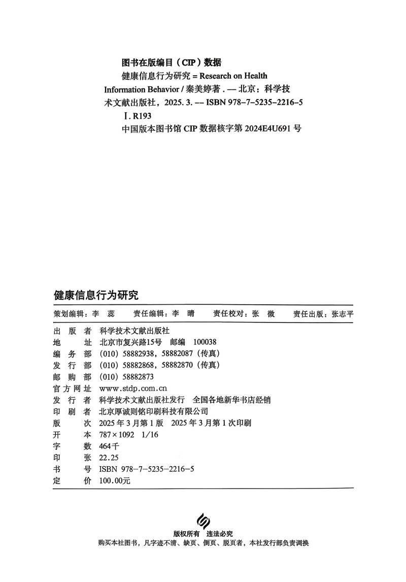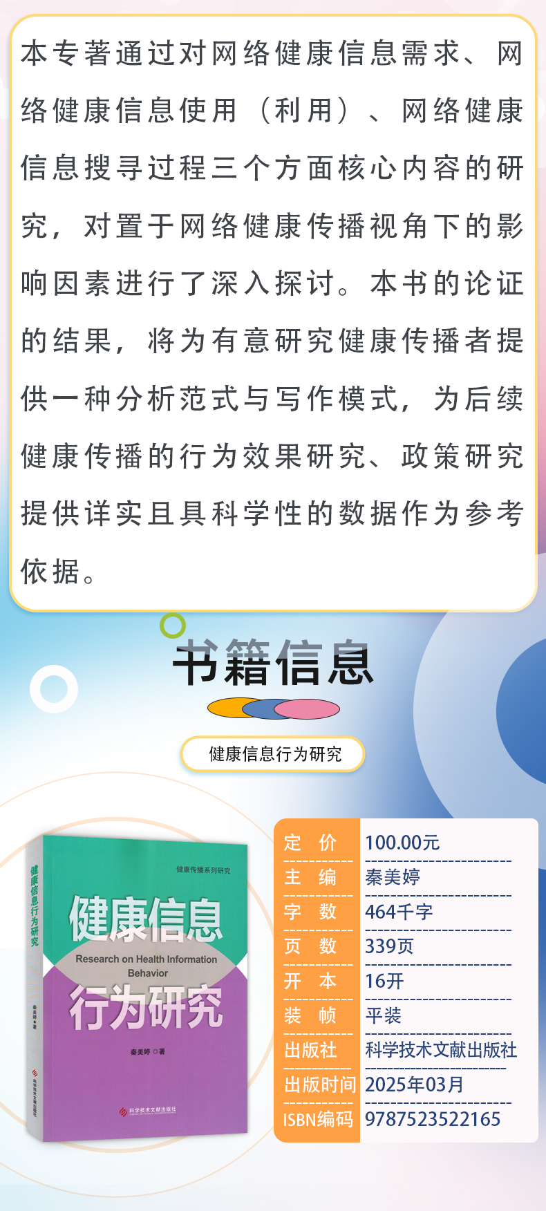 健康信息行为研究 健康传播系列研究 秦美婷 主编 将为有意研究健康传播者提供一种分析范式与写作模式 科学技术文献出版社