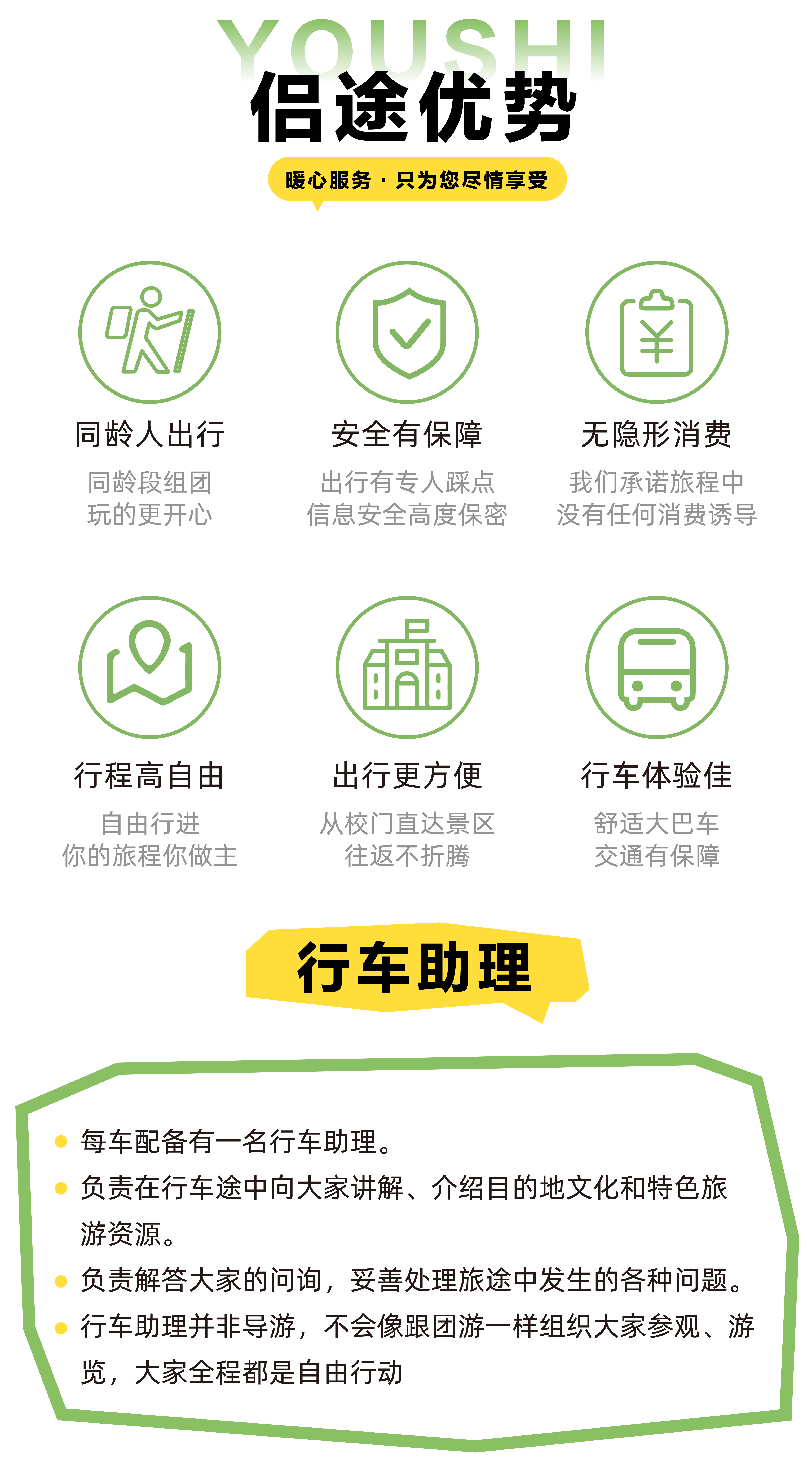 | 行车助理 | 仅负责行程活动中接待服务(非持证导游,不提供景区讲解服务不陪同进景区) |
