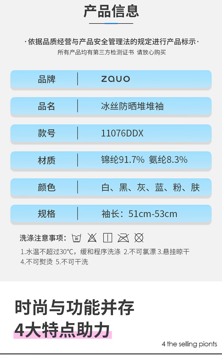 【分仓直发包邮】zauo冰丝防晒堆堆袖(白/黑/灰/肤/蓝/粉)ZA.XT.04.20.X2