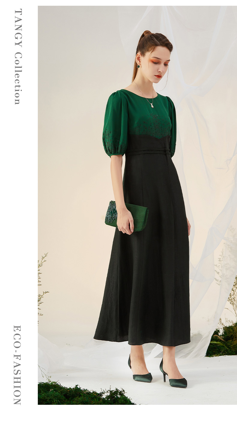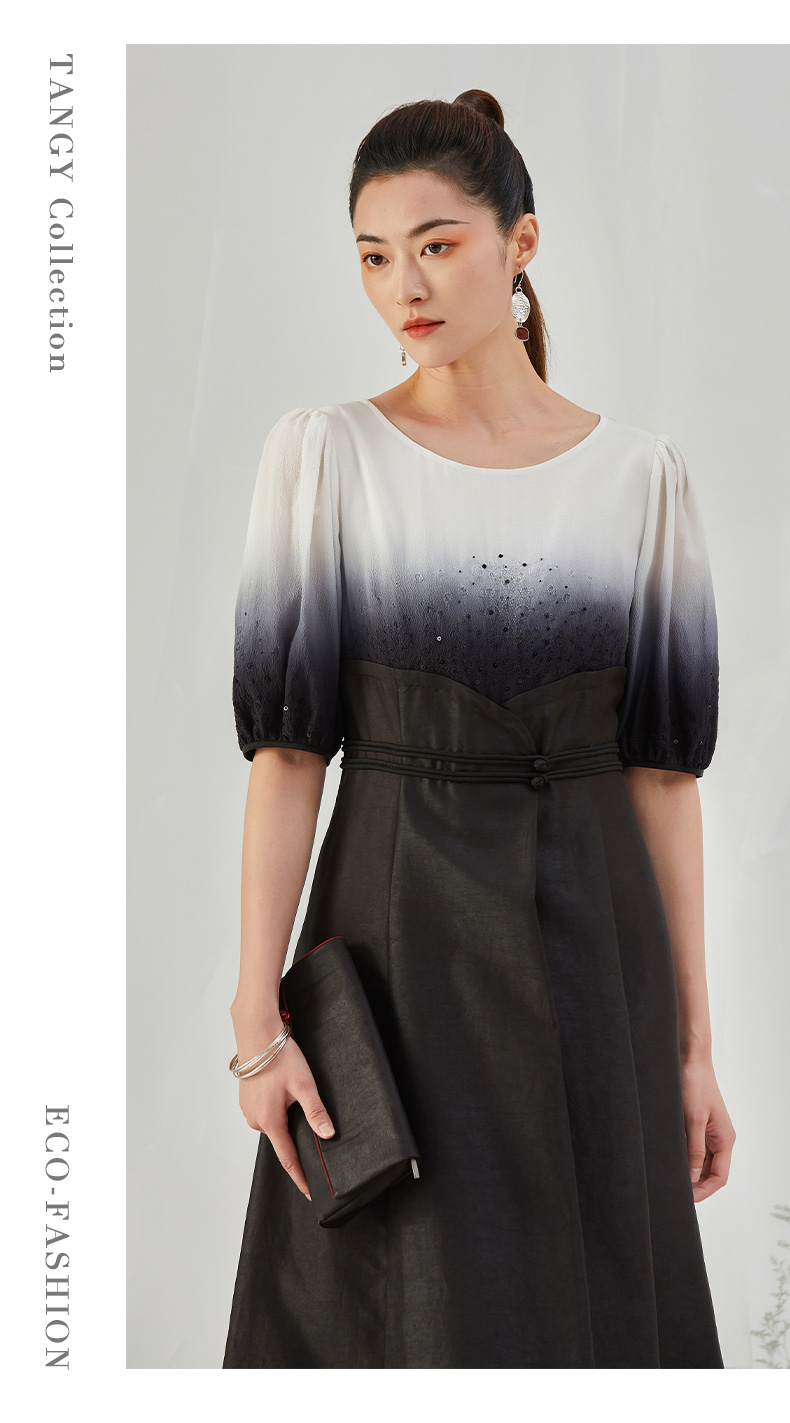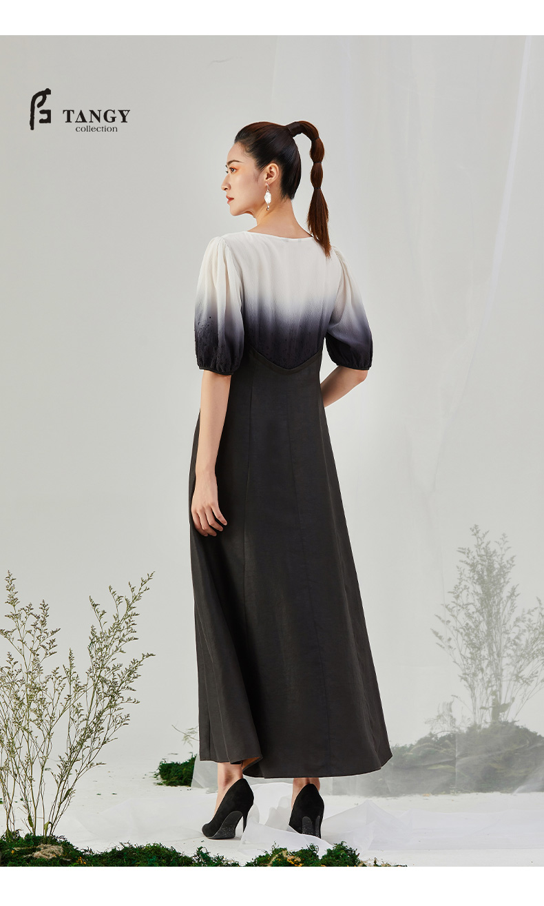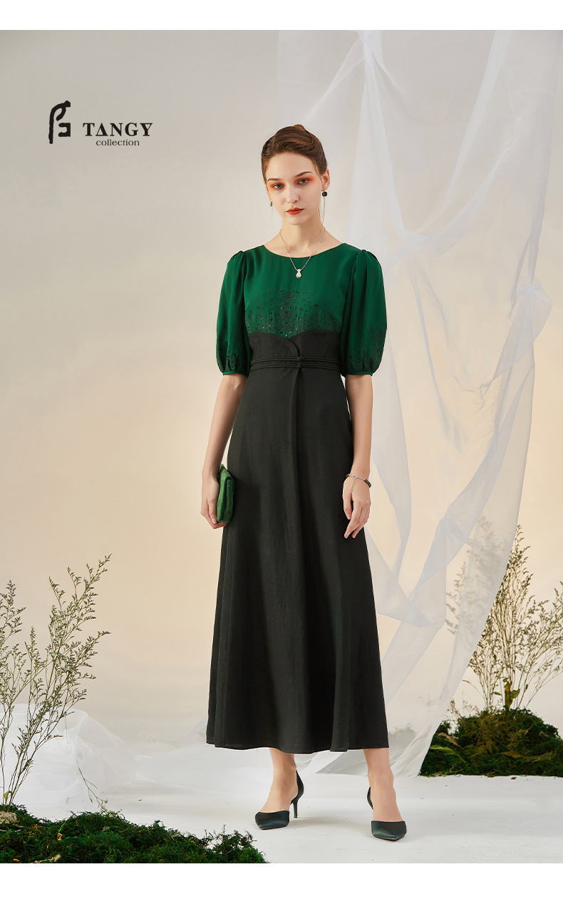 TANGY Collection/天意精品2021年秋季新品吊染拼撞莨绸高腰连衣裙