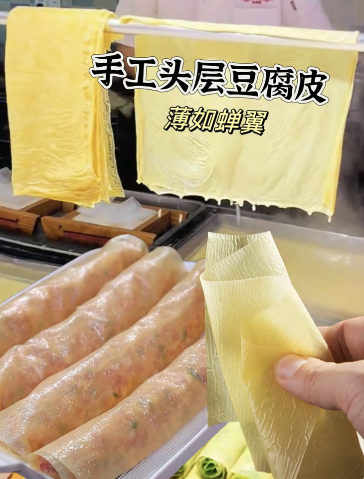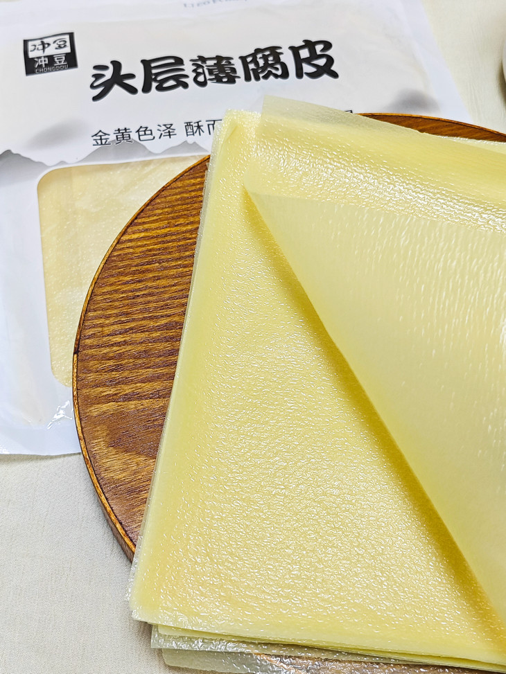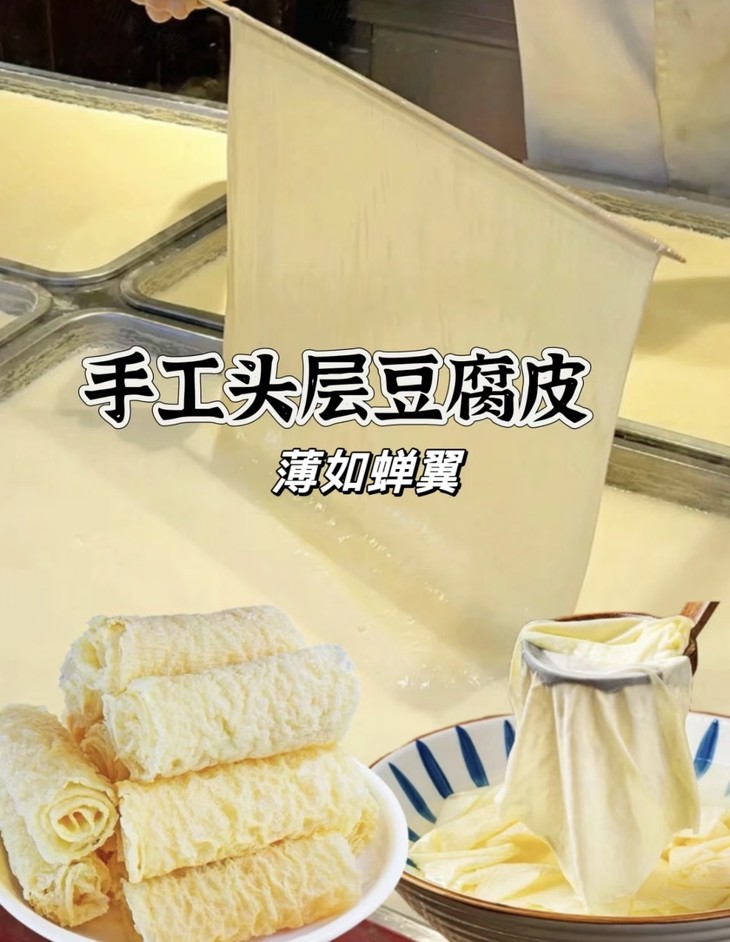 豆制品脑袋一定试试这款【头层薄腐皮】‼️ 头层手工制作豆腐皮,精选非转基因大豆➕饮用水,由豆浆高温煮开凝固表层而来 在豆浆表面轻轻一挑——一张薄如蝉翼、柔若丝绸的腐皮缓缓揭起,这便是头层薄腐皮,豆制品中的“黄金层”。 👉👉纯手工制作的薄薄嫩嫩的腐皮 入口爽滑鲜嫩🌟是经多道工序手工制作 风味和营养都被最大程度地保留下来 自带大豆天然油脂的香气~~ 柔嫩细腻,入口爽滑,咀嚼后唇齿留香😋 减脂姐妹都去冲‼️一口下去满满植物蛋白 减肥期间想吃一点好看又美味的减肥餐,头层薄腐皮必不可少📝