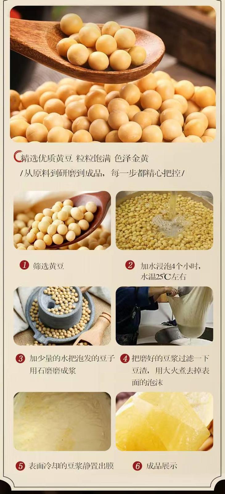 ⚠️制作腐皮的工艺 ✔️制作腐皮对手艺是非常考究的 将挑好的黄豆,清洗去掉豆壳 ✔️再放入饮用水水中浸泡 然后用石磨一点点磨出豆浆 ✔️磨出的豆浆香浓细腻,豆味十足 然后过滤掉豆渣,留下一桶醇香的豆汁 ✔️然后煮浆、成膜、揭皮 从而得到上佳且营养丰富的头层薄腐皮,回味还有点甜,最后再将这些腐皮自然晾晒
