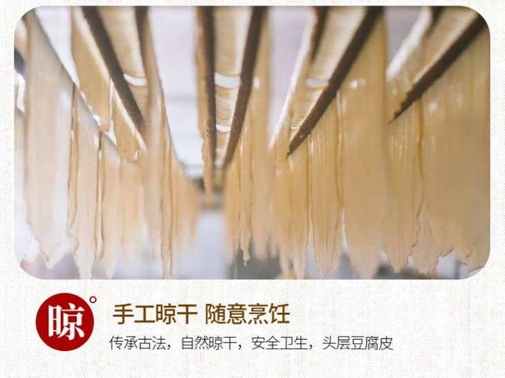 ✅ 选用优质非转基因大豆,颗粒饱满,蛋白质含量高 好豆子,是好腐皮的第一步 真材实料,制作工艺考究 选材➡泡豆➡磨浆➡过滤➡煮浆➡自然结皮➡挑皮➡烘干➡分切➡包装➡贮存 最值得一提的是注浆 采用连续注浆👉 永不间断如泉水般,源源不断的注及。 保证连续结皮的都是最新的头层皮衣 保证都是高品质,薄如蝉翼,劲道爽滑👀 一锅豆浆,在工业化的生产中,从头到尾要揭十几次。因为只取头层的皮衣,成本太高 为什么还坚持只取头层? 因为只有头层的腐皮才能保证蛋白质的含量在50%,营养更丰富 它能让腐皮的口感和营养都达到最佳的状态。越往后揭的腐皮营养成分就越低