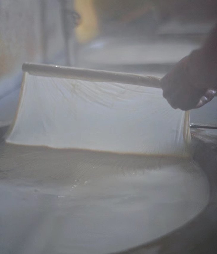 精选优质非转基因黄豆,纯手工古法制作 黄豆经过仔细的清洗、浸泡,然后被磨成细腻的豆浆 这豆浆就像牛奶一样洁白浓稠,散发着淡淡的豆香 接着,将豆浆倒入特制的大锅中,用文火慢慢熬煮 在这个过程中,老师傅们全神贯注,眼睛紧紧盯着锅里的变化 手中的大勺不时地搅拌着,就像在演奏一首美妙的乐章🎶。 当豆浆表面开始凝结出一层薄薄的豆皮时 竹竿轻轻一挑,一张晶莹剔透、薄如蝉翼的豆腐皮就被完整地揭了起来