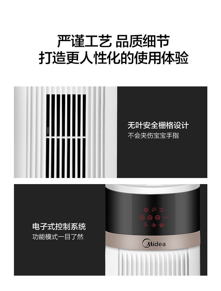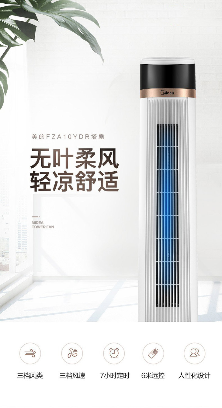 美的(508584)遥控无叶塔扇FZA10YDR 三档风速 摇头广角送风 家用智能预约定时电风扇节能立式落地扇 正常风 遥控控制