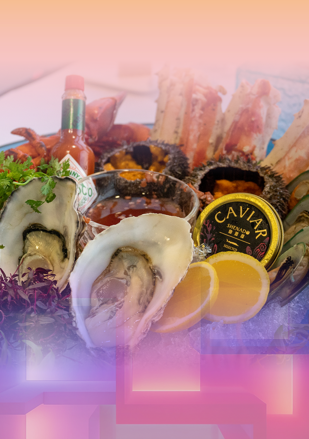 Boston Lobster 2pcs,King Crab Legs 4pcs,Sea Urchin 4pcs, Gillardeau Oysters 4pcs,Mussels 8pcs,Caviar 30gr