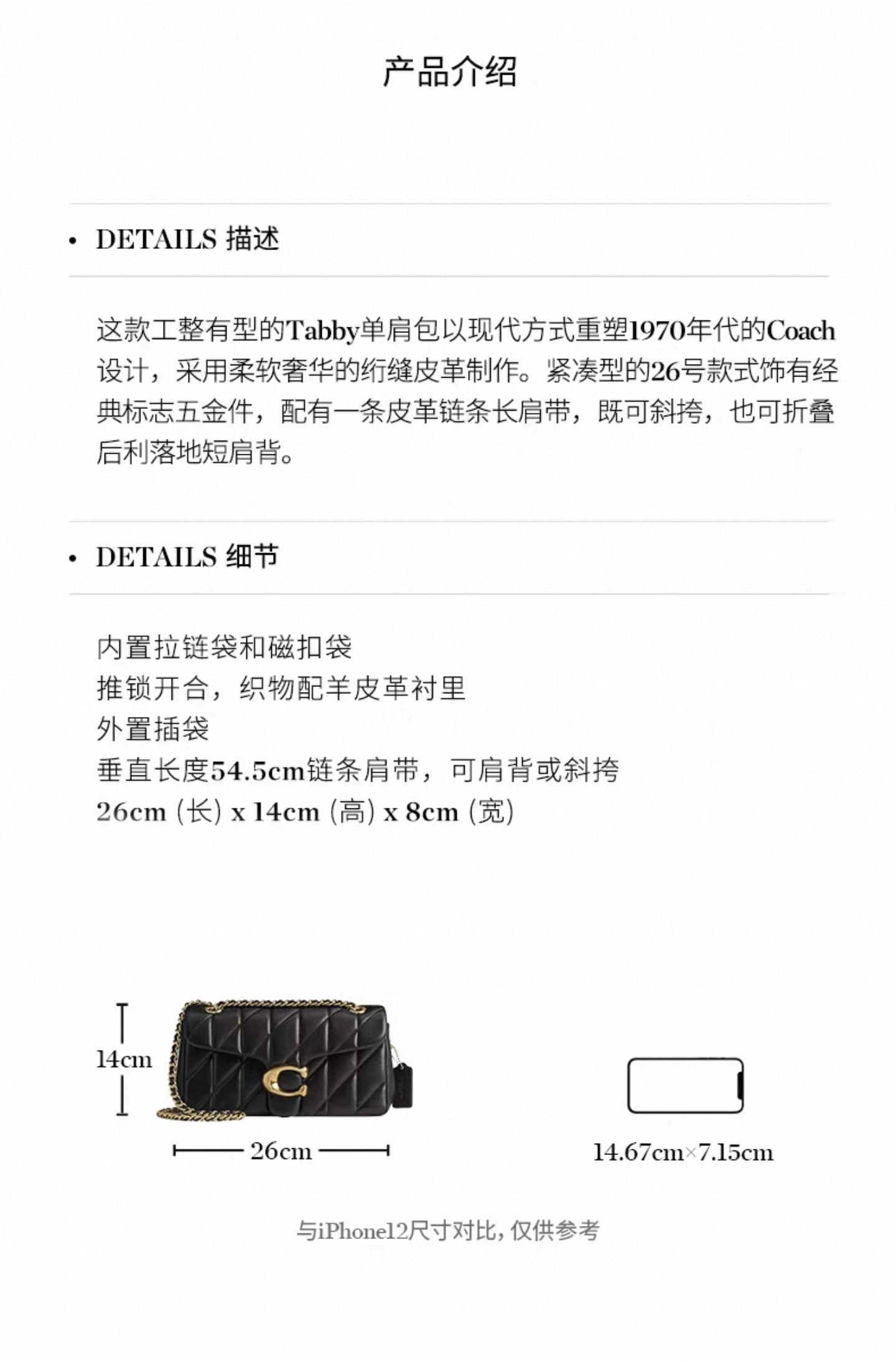 【新品上新 明星同款】COACH/蔻驰 香港直邮 女士菱格纹绗缝 TABBY 26号单肩包斜挎包 CP149/CP150 香港直邮 送礼盒礼袋 清关约7个工作日-w