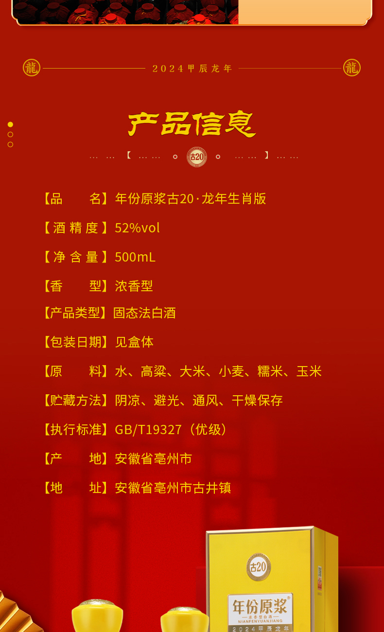 古井贡酒年份原浆古20龙年生肖版 52度500ml*1瓶 浓香型白酒 商品图3