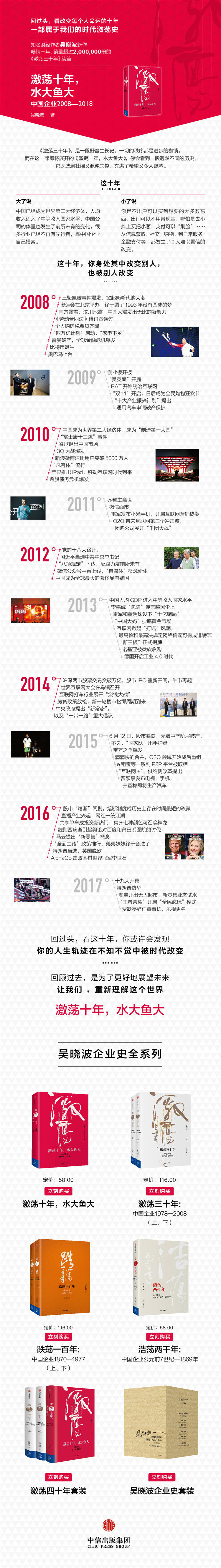 作为时代记录者,吴晓波有意识地从1978年中国改革开放伊始,记录中国翻天覆地的变化和对我们影响至深的人物与事件,串成一部我们每个人的时代激荡史。而*新的这十年,无疑更壮观,也更扑朔迷离。