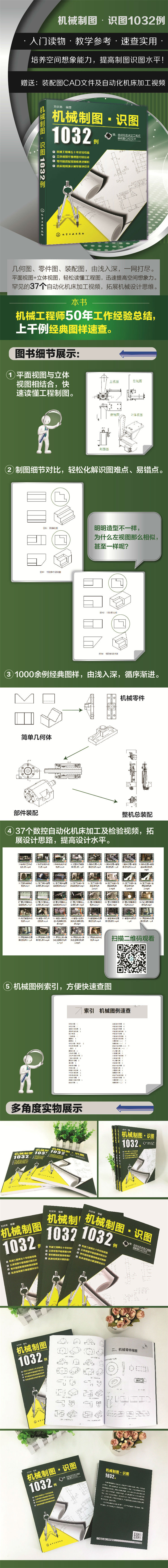 机械制图是重要的工程语言。传统的平面视图表达抽象、晦涩,阅读起来比较费力,需要读图者具有一定的空间想象力。因此,本书所有图例在平面视图旁边增加立体视图,使图形变得更加直观。本书以简单形体及零件图为主要内容,包括几何体视图、机械零件视图、部件装配图和WG-CNC总装配图4部分,共有1032例经典图例。内容由浅入深,有助于培养读者的空间想象能力,使读者的制图、识图能力得到提升。本书附赠自动化机床加工视频及装配图CAD文件,供读者参考。