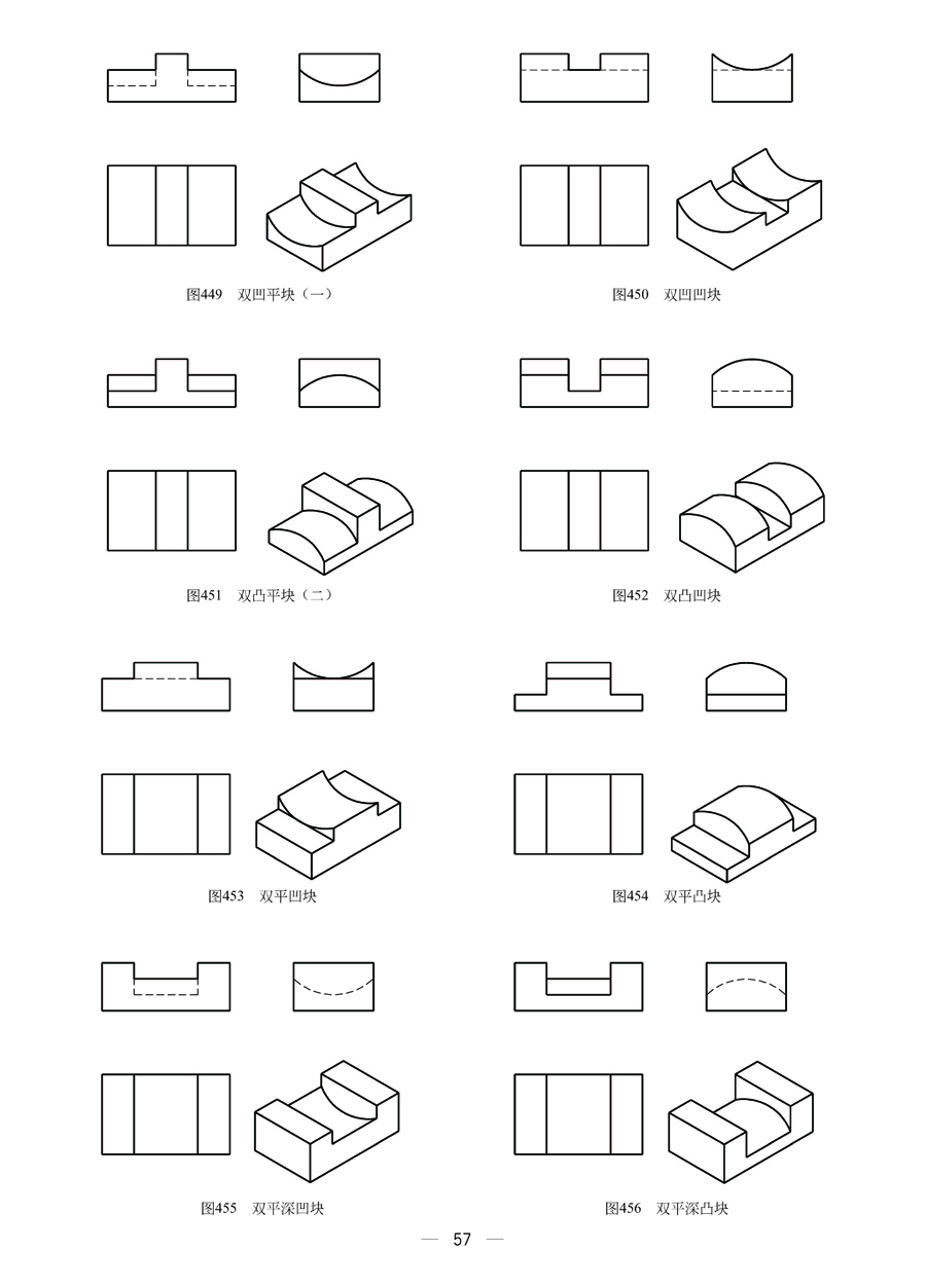 机械制图是重要的工程语言。既然是语言,那就要求绘图设计者的表达清楚,能让人理解得快,理解得准确。绘图设计者如何把自己的设计意图既快而又准确地传达给读图者,比较好的方法就是在图纸的平面视图旁边增加工程图的立体图,用以展示和检验设计效果,这样读图者就能通过立体视图和平面视图的对照轻松地理解图纸的语言。因此完整的工程图纸应包括平面视图和立体视图两方面。增加了立体图语言后表达就充分了,给读图的人带来很大的方便,读懂图纸人的层次会增加数倍,甚至年轻工人都能读懂。此外,通过绘制立体图也可检查和验证平面视图的设计绘制是否正确。鉴于立体视图的重要性,笔者主张在平面视图上配置立体视图,这是编著本书的重要原因之一;原因之二是通过大量的图例提高年轻学子及工程技术人员设计的空间想象力,弥补“画法几何及机械制图”纯理论授课的不足。